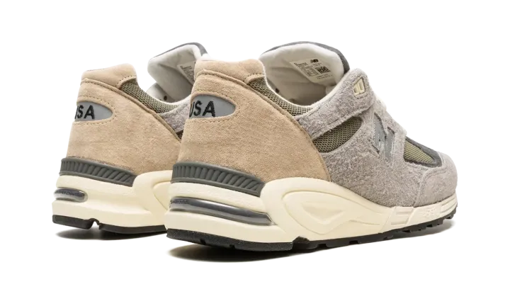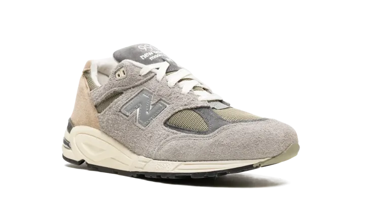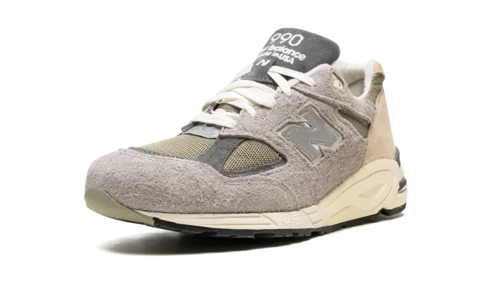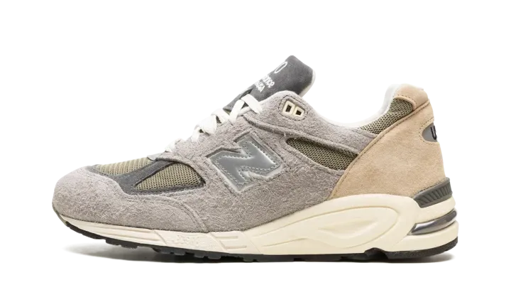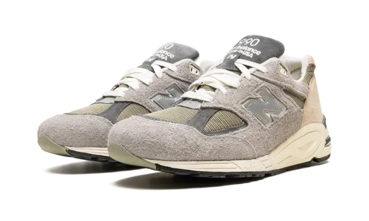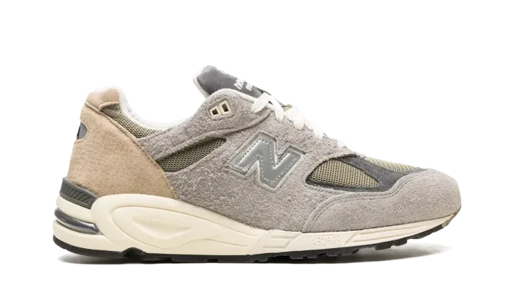 The Teddy Santis x New Balance 990 V2 "Made in the USA" is one of several styles from the acclaimed footwear and fashion designer's first-ever "Made in the USA" collection. The highly anticipated partnership between Santis, who is the founder and lead designer of Aime Leon Dore, was announced in 2021, and made a reality in April 2022. Santis is the head of New Balance's "Made in the USA" footwear program. Here, on the 990 V2, the shoe features hairy grey suede overlays atop an olive green mesh base. A tan suede overlay is found on the heel. A reflective "N" logo is located on both sides of the shoe. "USA" branding appears on the heel and "990" and "Made in the USA" detailing is embroidered in white on the dark grey suede tongue. The cream-colored rubber midsole gives the shoe a vintage look. Release date: April 28, 2022