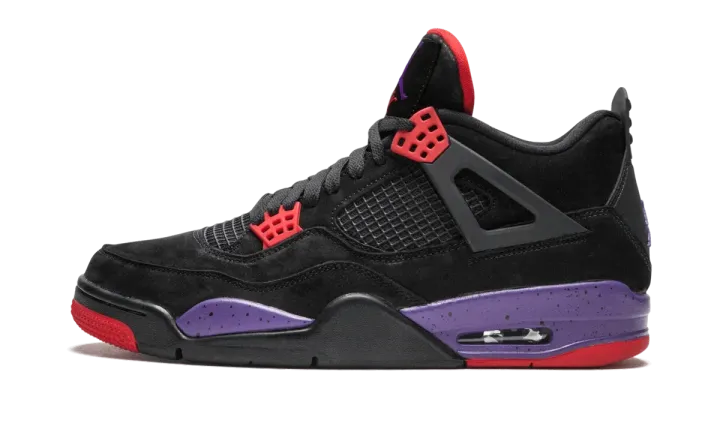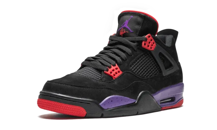 The Air Jordan 4 "Raptors" with Drake's signature is a special limited edition re-release of the colorway featuring the rapper's signature on the tongue patch. Initially released in August 2018, the "Raptors" colorway of the Jordan 4 in black nubuck with red and purple accents returned in June of 2019 as a special release in light of the Toronto Raptors playing in the NBA Finals. The re-release includes the signature of Drake, the team's most famous cheerleader, on each tongue tag. The Air Jordan 4 "Raptors" with Drake's signature released on June 2, 2019 in a surprise launch on Nike SNKRS and sold out quickly. Now it is a rare and coveted sneaker for Air Jordan, Drake, and Toronto Raptors fans alike.