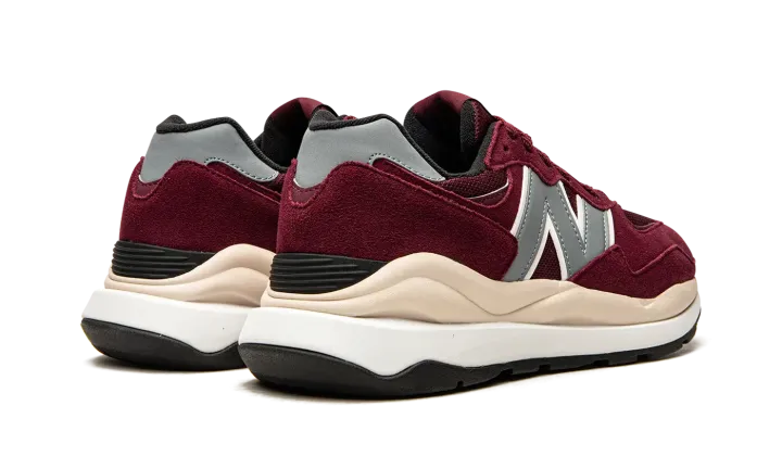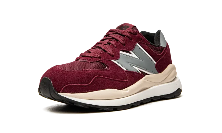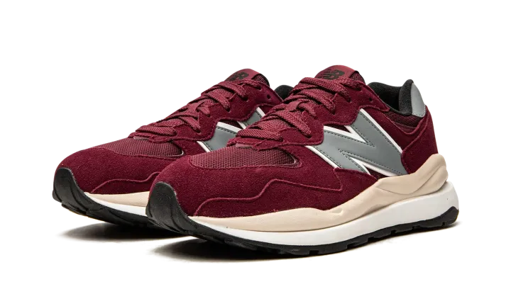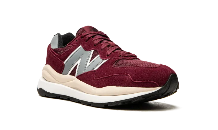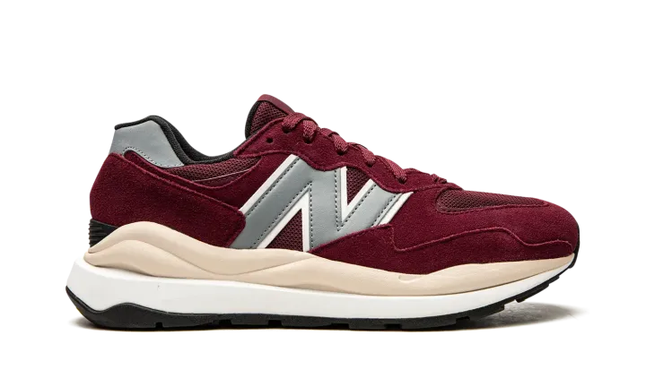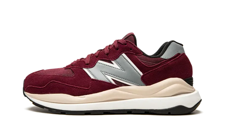 The New Balance 57/40 "Garnet" is a fall-ready look for the retro-modern lifestyle shoe by the heritage footwear brand. The 57/40 silhouette joined New Balance's footwear collection in 2020 and is a tribute to the New Balance 574. Design details include Garnet-colored mesh on the toe and collar and tonal suede overlays. An oversized, reflective "N" logo is found on either side. Black "NB" insignia is printed on the maroon nylon tongue tag on the tonal mesh tongue. A reflective heel tab contrasts the look of the Garnet suede on the back of the shoe. A chunky, retro-inspired cream foam midsole gives the shoe a decidedly vintage, performance running shoe-style look.