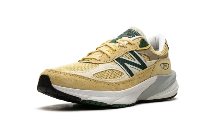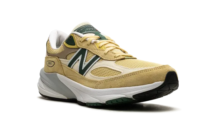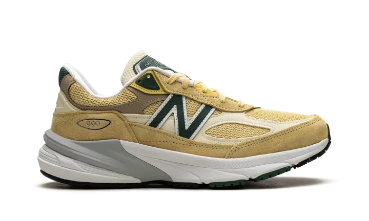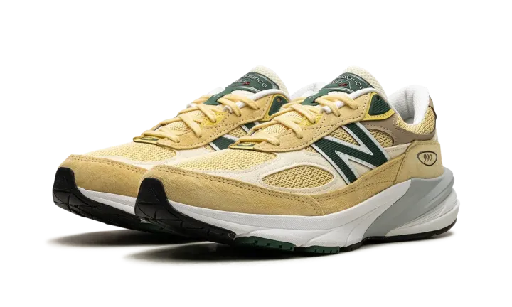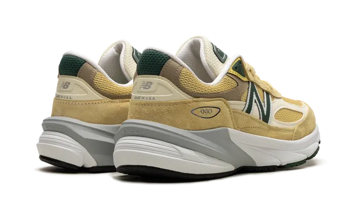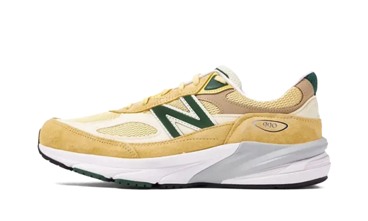 The New Balance 990v6 "Made In USA - Pale Yellow" is a colorway of the lifestyle shoe with a yellow-based design. The upper features a Pale Yellow mesh construction with yellow pigskin suede and nubuck overlays. A green "N" logo can be seen on either side of the shoe. Other green accents appear on the top eyelet overlay and on the heel. "990" branding is found on the lateral side of the heel while "New Balance 990v6" detailing is located on the tongue. New Balance combines its comfortable ABZORB cushioning with FuelCell and ENCAP technology in the shoe's sizable midsole. Release date: August 31, 2023