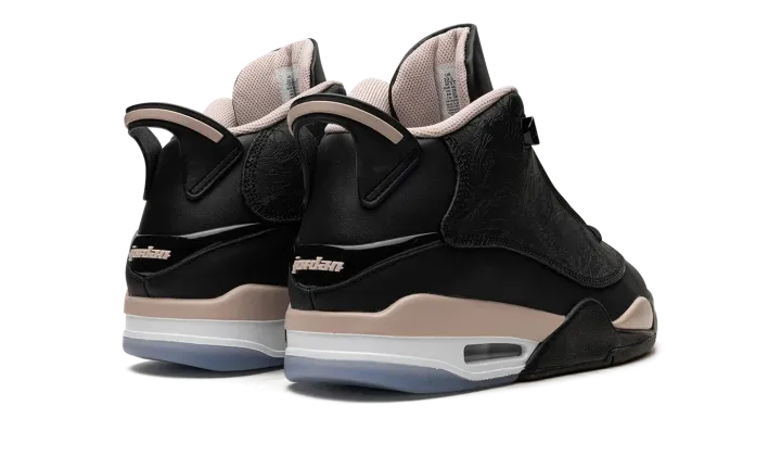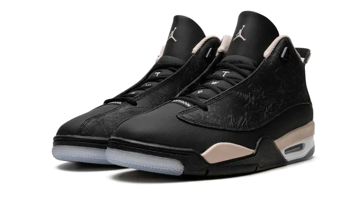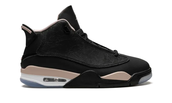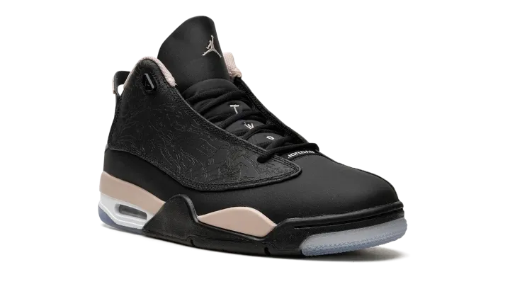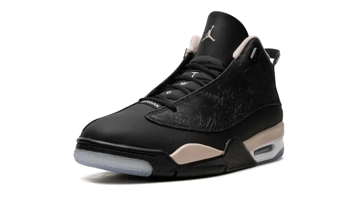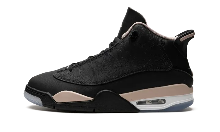 The Jordan Dub Zero "Black/Fossil Stone" is a black-based colorway of the hybrid shoe with design elements from multiple classic Air Jordan models. The Jordan Dub Zero features design cues from a long list of legendary Jordans, including the Air Jordan 4, Air Jordan 6, Air Jordan 11, Air Jordan 12, Air Jordan 13, Air Jordan 15, Air Jordan 17, and Air Jordan 20. On the "Black/Fossil Stone," the shoe has a black leather upper with laser print on the side panels. A glossy black patent leather mudguard gives the shoe a sleek look. Fossil accenting lands on the Jordan 6-inspired rear spoiler, on the Jordan 4-inspired outsole, and on the Jumpman and "Two 3" branding on the tongue. Release date: January 17, 2023