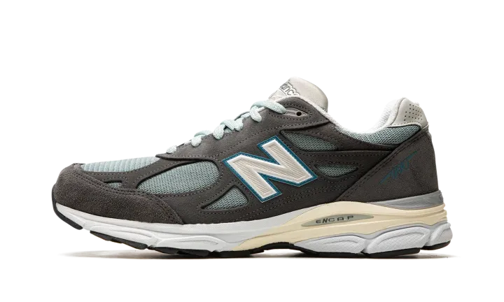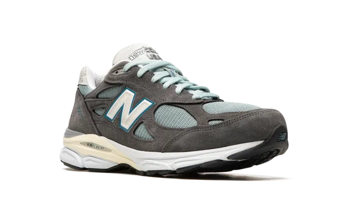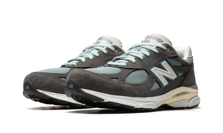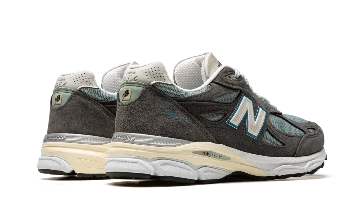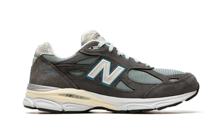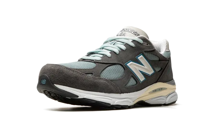 The Kith x New Balance 990 v3 "Steel Blue/Grey" is a versatile colorway for the popular casual shoe by the Boston footwear company. The "Steel Blue/Grey" features dark grey suede overlays on a Steel Blue-colored mesh base on the shoe's upper. The 990 v3's signature "N" branding appears on the sides in cream with a blue trim. Additional Steel Blue accenting comes into focus on the heel overlay with "NB" branding, on the laces, and on the small "NB" logo found on the toe of the outsole. An ENCAP cushioned white-and-cream midsole completes the look.