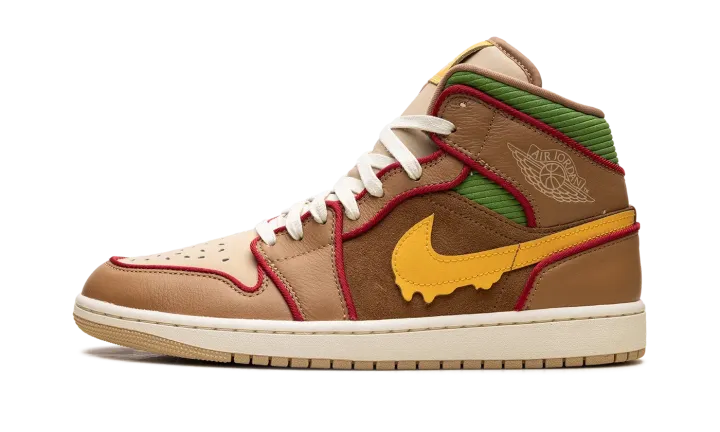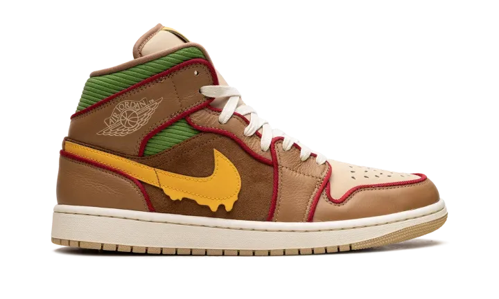 Get a taste of truly unique sneaker design with the playful Jordan 1 Mid SE "Cheeseburger." This special edition uses a mix of premium leather and suede to cleverly emulate the iconic American meal. Featuring bun-colored tan, lettuce-green ankle padding, ketchup-red accents, and a yellow "melting cheese" Swoosh, every detail is mouth-watering. With the classic Air cushioning, these are the fun, flavorful kicks that are guaranteed to spark conversation.