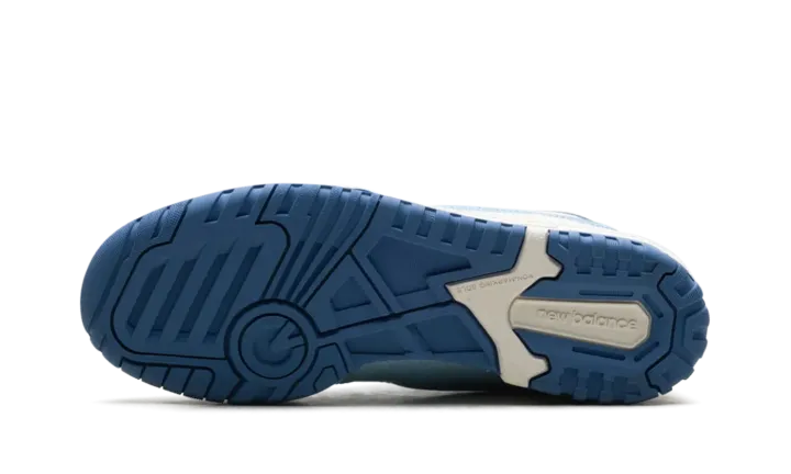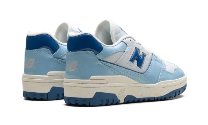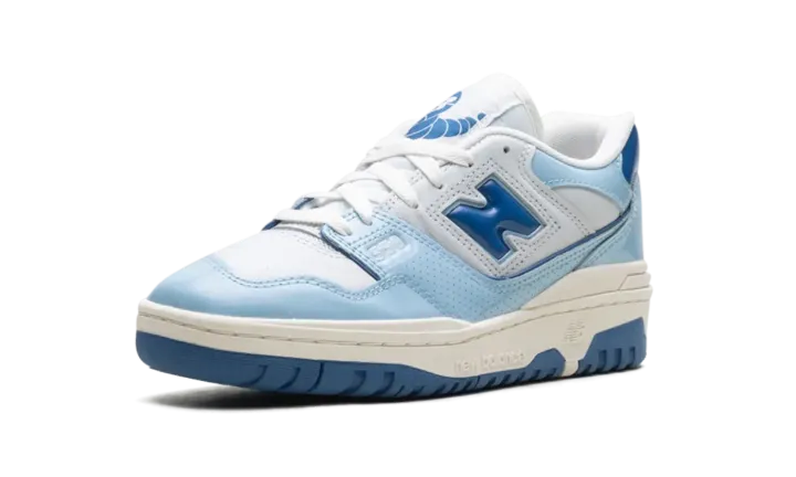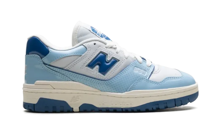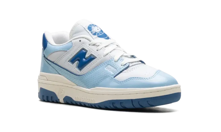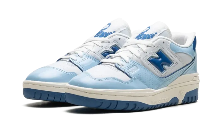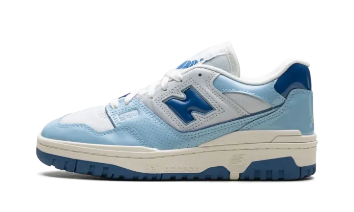 The New Balance 550 "Patent - White/Powder Blue" is a colorway of the retro basketball shoe with glossy patent leather details. The New Balance 550 in "White/Powder Blue" is complete with a Sea Salt smooth leather base and Sea Salt dotted leather overlays. Dark blue patent leather appears on the "N" logo on the sides, and on the heel tab. A Powder Blue patent leather mudguard contrasts the shoe's neutral base. Classic "New Balance 550" insignia can be seen on the tongue tag. A Sea Salt-colored "NB" logo is found on the heel. Underfoot, a Sea Salt rubber midsole and blue rubber outsole complete the look.