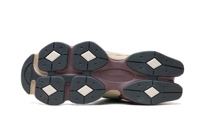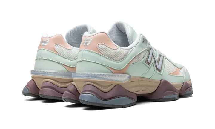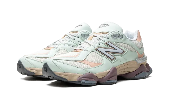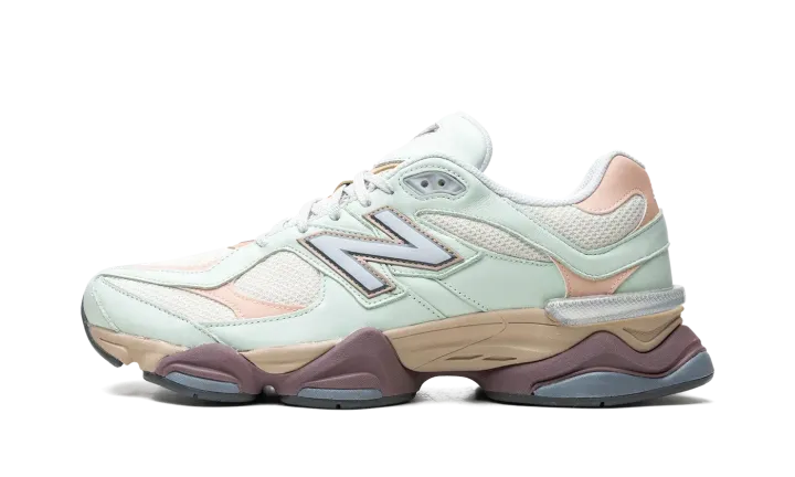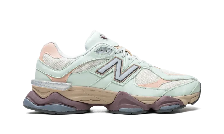 Discover the unique New Balance 9060 "Clay Ash." Released in Spring 2024, this lifestyle shoe features a cream mesh upper accented with soft mint and pink overlays. An oversized silver "N" with burgundy trim adds a stylish touch, while "NB 9060" detailing appears on the tongue. The chunky midsole, with EVA and ABZORB cushioning, showcases a burgundy hue and aged finish.