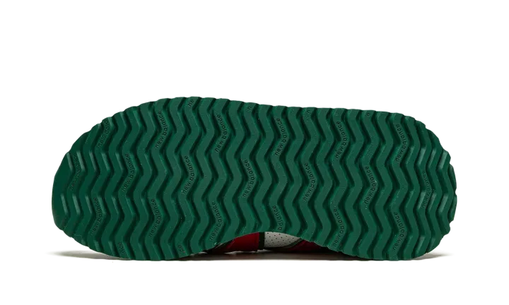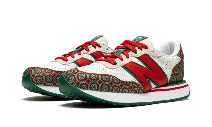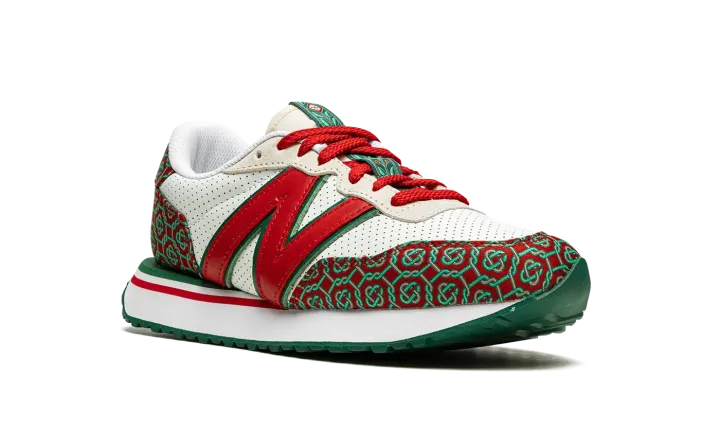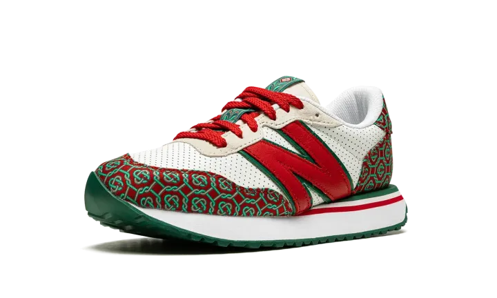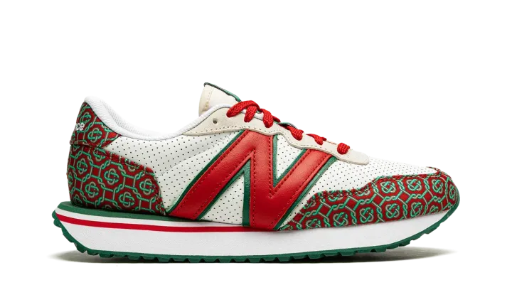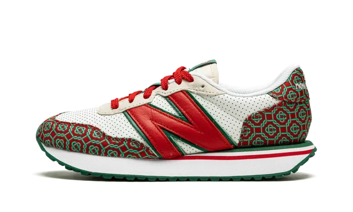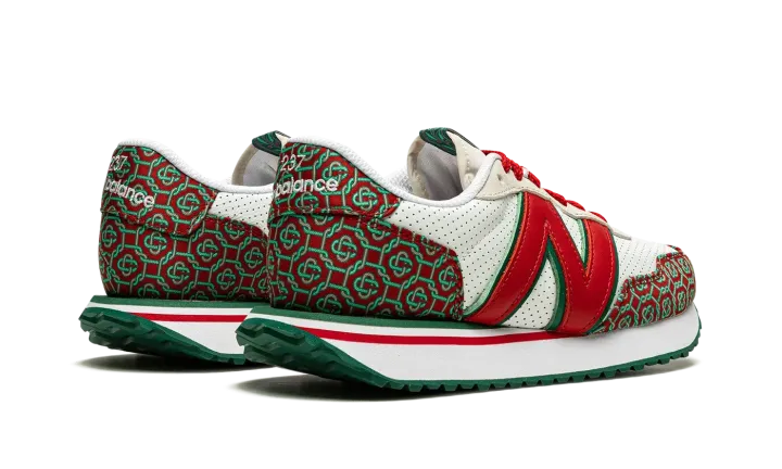 The Casablanca x New Balance 237 "Red Monogram" is one of two shoes within the Spring 2021 collaboration between the Parisian fashion label and New Balance. Also included in the "Red Monogram" pack is a Casablanca-designed New Balance 327 and, like that sneaker, the 237 model features a luxury-inspired design with a colorful and bold monogram print. The premium pattern appears on both the toe and the heel and contrasts with the white perforated leather base. A giant, dark red leather "N" logo appears on both sides of the shoe. Casablanca supplies additional luxury styles to the nylon overlay on the cream tongue. The white midsole is contrasted by a green tread outsole with a zig-zag pattern.