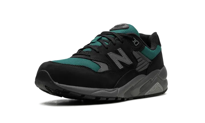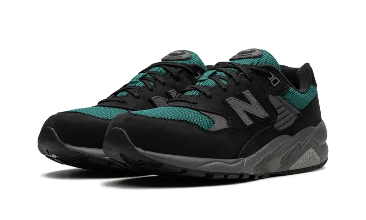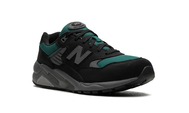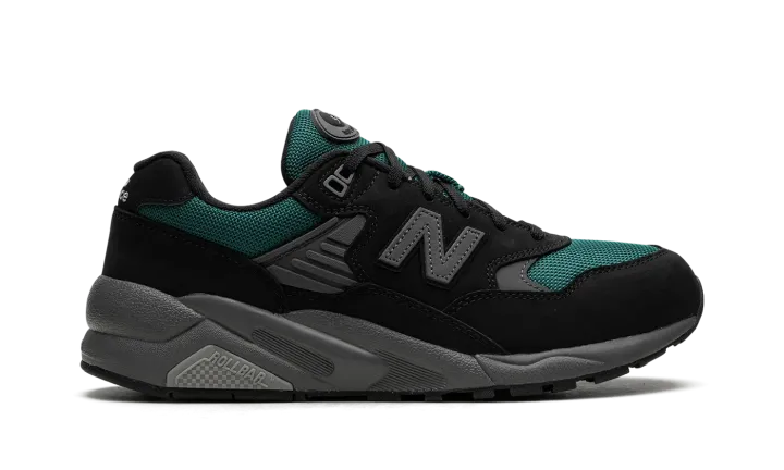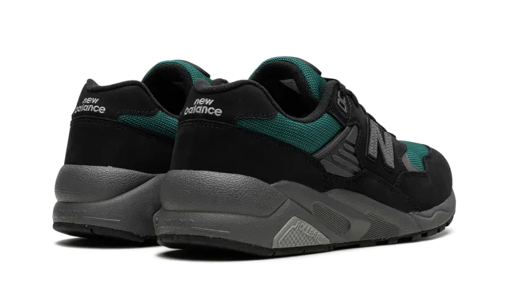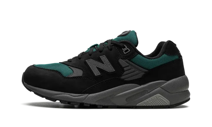 The New Balance 580 "Black/Teal" is a colorway of the retro running shoe with a two-tone appearance. The 580 was originally released in 1992 and was brought back as a lifestyle shoe in recent years. Here, on the "Black/Teal" colorway, the shoe is complete with a teal mesh construction with black synthetic nubuck overlays. A dark grey "N" logo appears on each side of the shoe. Additional "580" detailing can be seen on the tongue. A "New Balance" logo is embroidered on the heel. Underfoot, the shoe takes on a throwback-inspired vibe with an intentionally aged midsole Rollbar-cushioned midsole.
