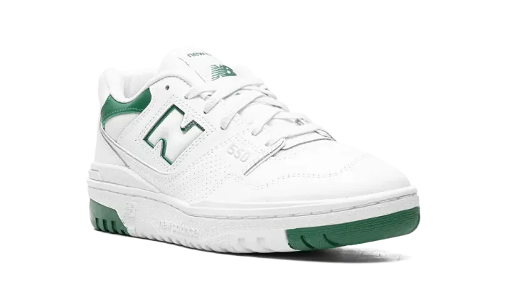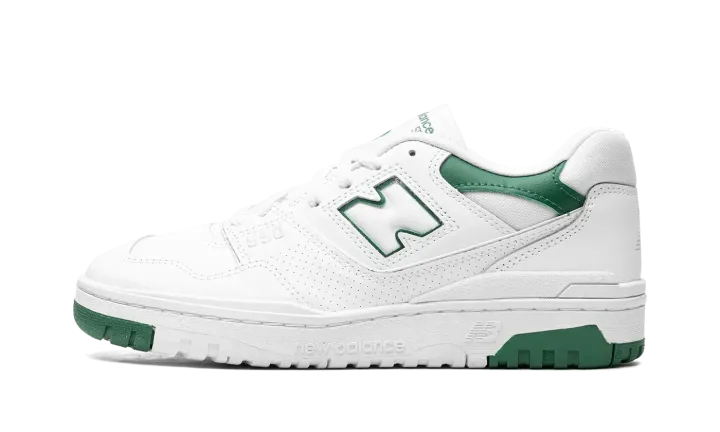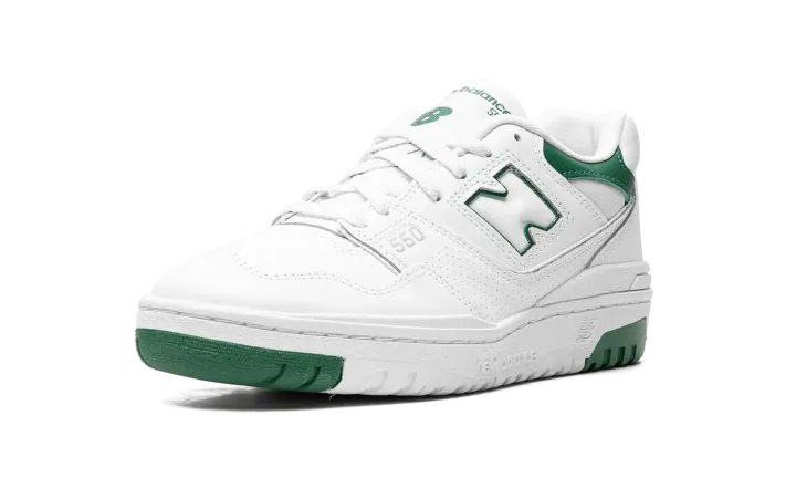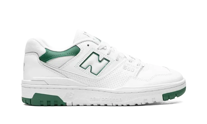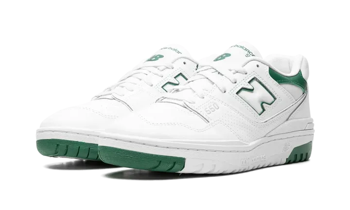 The New Balance 550 "White/Classic Pine" is a mostly all-white colorway of the retro basketball sneaker with subtle green details. A versatile look for the 550, the "White/Classic Pine" colorway features a white mesh upper with tonal leather overlays. A milky white "N" logo with green trim appears on either side of the shoe. The "550" logo on the forefoot is embroidered in white while the "NB" branding on the heel is printed in grey letters. Classic Pine leather is found on the collar. The shoe's white rubber midsole is complemented by a white and green rubber outsole. Release date: June 1, 2023
