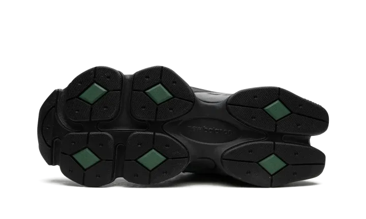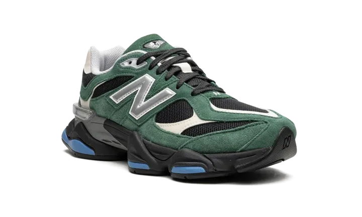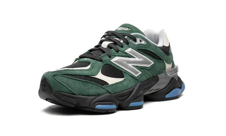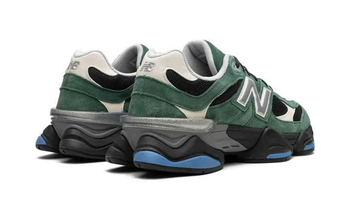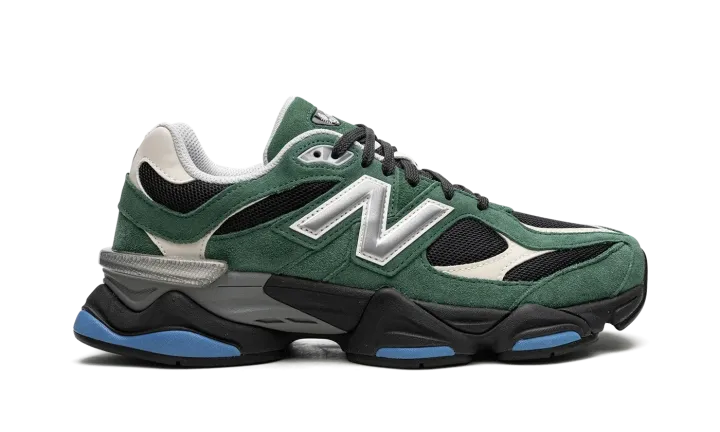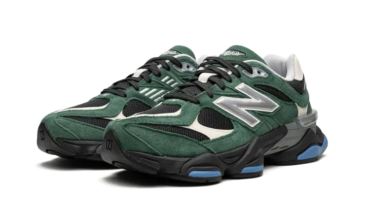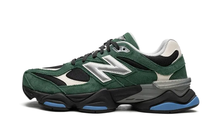 The New Balance 9060 "Forest Green" is a colorway of lifestyle shoe with an earth tone appearance. The colorway features a black mesh base that's contrasted with a tan leather overlay on the toe and heel and Forest Green suede overlays throughout the upper. An oversized silver "N" logo appears on the sides. "9060" branding is seen on the tongue. A grey "NB" logo is embroidered on the back of the collar. Underfoot, the shoe is complete with a chunky black and grey rubber midsole that gives the design a retro look. Release date: April 4, 2023