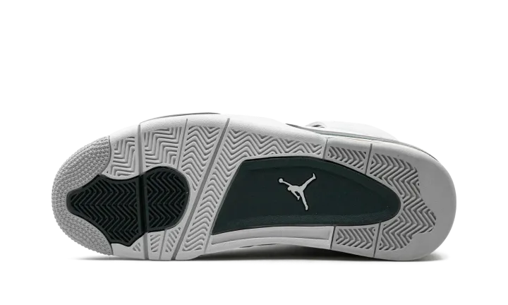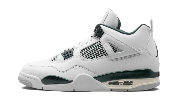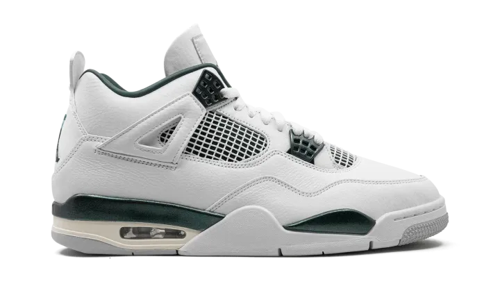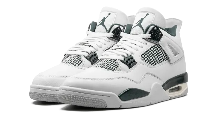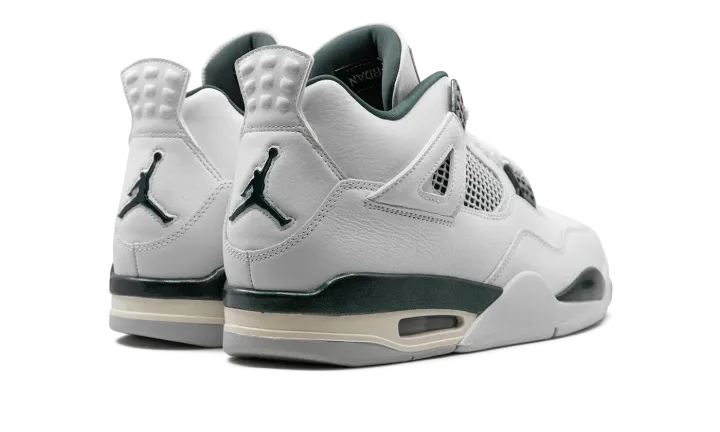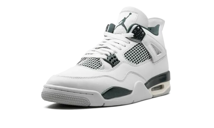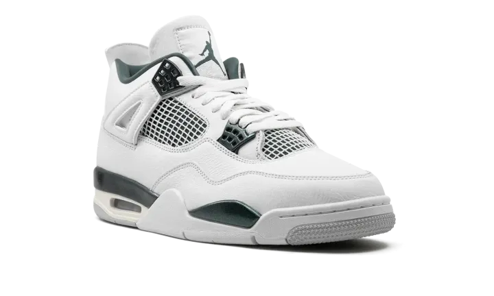 The Air Jordan 4 "Oxidized Green" is a colorway of Michael Jordan's fourth signature shoe with green details. A versatile look for the iconic silhouette, the upper features a white leather design with tonal netting on the mid-panel and tongue. Contrasting Oxidized Green accents can be found on the molded eyelets, the lace "wings," and on the heel tab, branded with a classic Jumpman logo. An additional Jumpman can be found on the tongue tag. Underfoot, an Oxidized Green mudguard, a vintage-inspired Sail midsole, and a visible Air unit in the heel complete the look. Release date: July 13, 2024