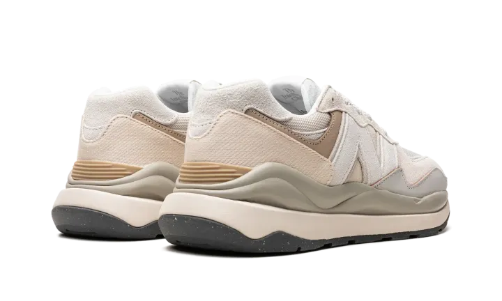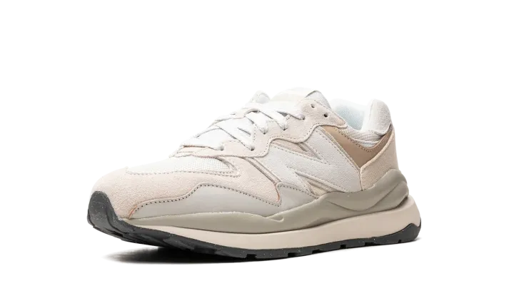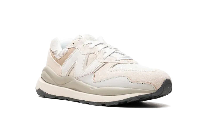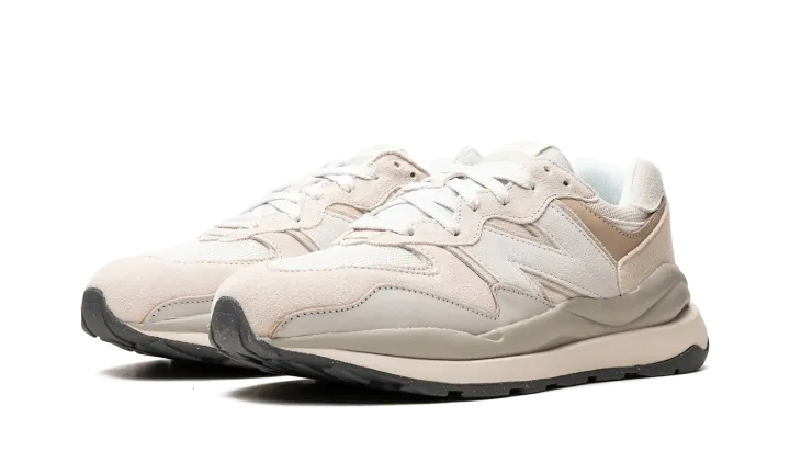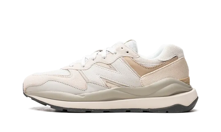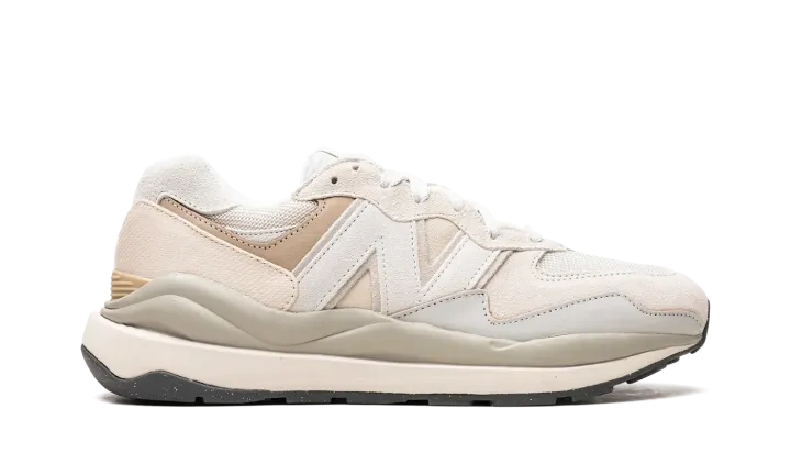 The New Balance 57/40 "Moonbeam" is a versatile, neutral-based colorway of the sneaker with a retro-modern look. Originally released in 2020, the New Balance 57/40 updates the popular and classic New Balance 574 with a contemporary design. The "Moonbeam" features a white mesh toe with beige suede overlays on the toe cap, forefoot, and eyelets. An oversized white suede "N" logo appears on the side. "NB" and "57/40" detailing are seen on the white nylon tongue tag. A chunky, retro-inspired cream foam midsole gives the shoe a vintage performance running shoe look. Release date: May 21, 2022