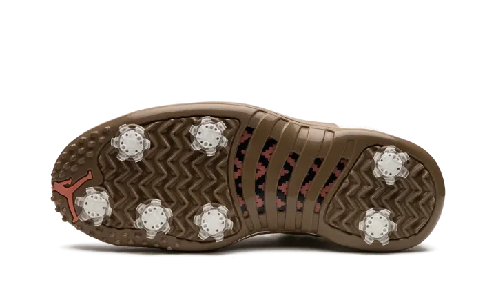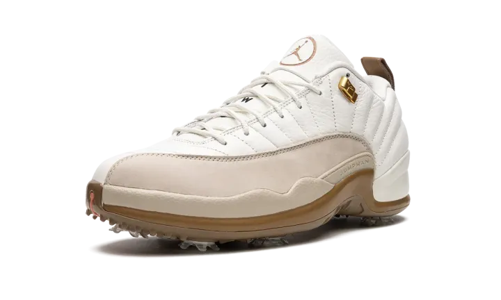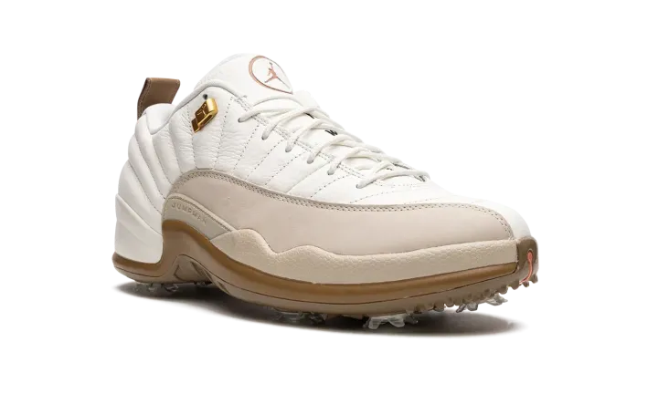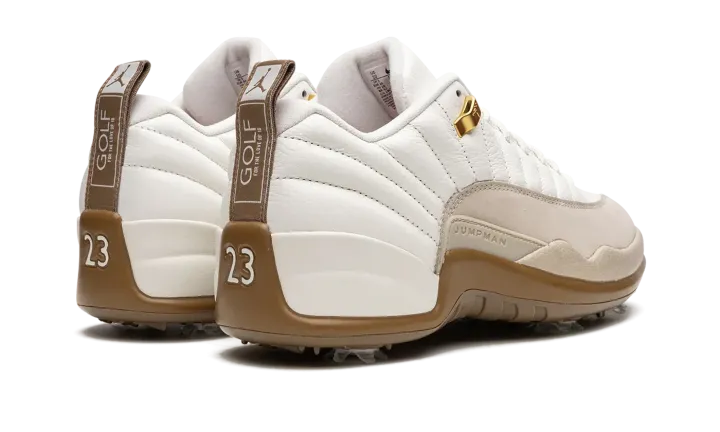 The Air Jordan 12 Golf "Driftwood" is an alternate version of the retro basketball shoe designed for the golf course. Jordan Brand's Jordan Golf collection debuted in 2022 before exploding in popularity in 2023 due to the success of releases such as the Air Jordan 1 Low Golf "Chicago," Air Jordan 4 Golf "Bred," and this Jordan 12 Golf in "Driftwood." Here, the colorway features a white leather upper with a Driftwood suede mudguard. Metallic Gold eyelets combine with the copper-colored Jumpman logo on the tongue to give the shoe a premium look. Underfoot, a cleated outsole provides traction on the fairway. Release date: June 15, 2023