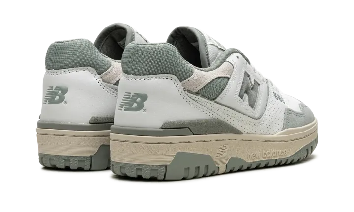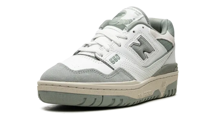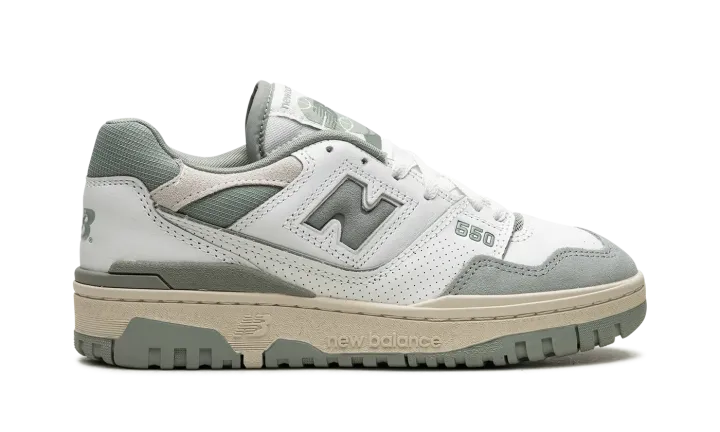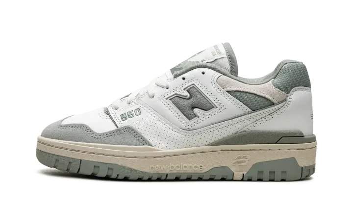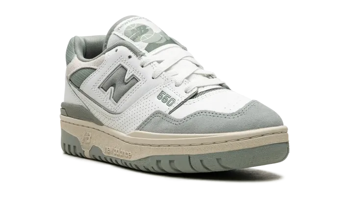 The New Balance 550 "Seafoam Green" is a colorway of the retro basketball and lifestyle shoe with eye-pleasing green accents. Debuted in the late 1980s and reissued in 2020 due in part to Aimé Leon Dore, the New Balance 550 has a classic, old school basketball shoe design. Here, the sneaker is featured with a white leather construction with Seafoam Green accenting on the "N" logo on the sides, the "550" branding on the lateral side of the forefoot, and on the suede overlay on the toe. The green hue is also seen on the "NB" branding on the tongue and heel, and on the mesh found on the collar. Underfoot, the shoe's aged midsole is paired with a Seafoam Green outsole.