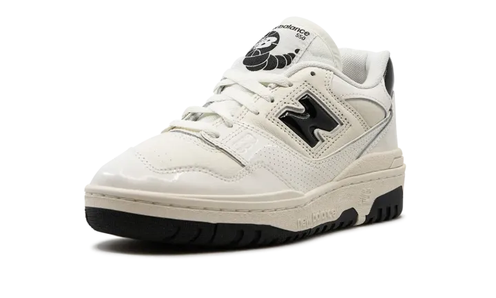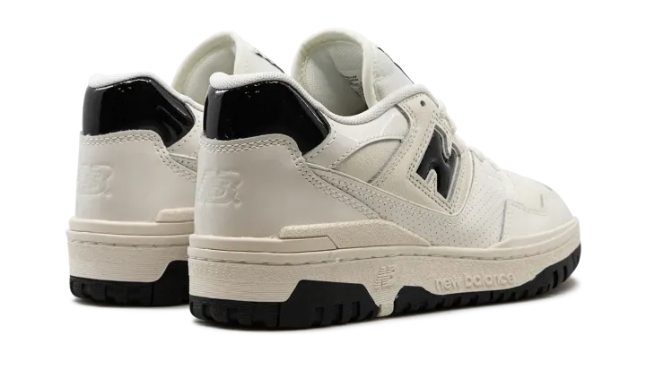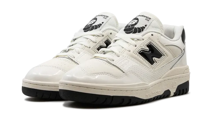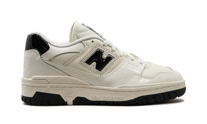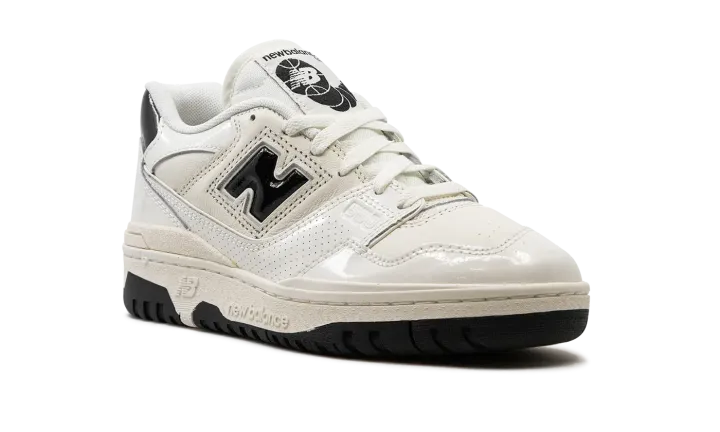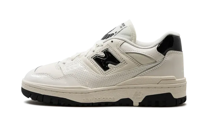The New Balance 550 "Sea Salt/Black Patent Leather" is a colorway of the retro basketball shoe with shiny patent leather details. The New Balance 550 in "Sea Salt/Black Patent Leather" features a Sea Salt white leather base with shiny patent leather overlays in the same hue. Black patent leather appears on the "N" logo on the sides, and on the heel tab. Additional black accenting appears in the form of "New Balance 550" insignia on the tongue tag. Underfoot, a Sea Salt rubber midsole and black rubber outsole combine to put the finishing touches on the flashy design.