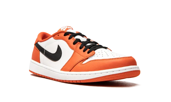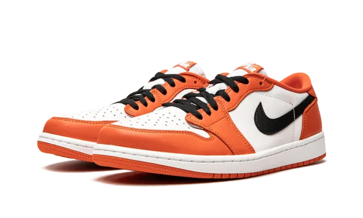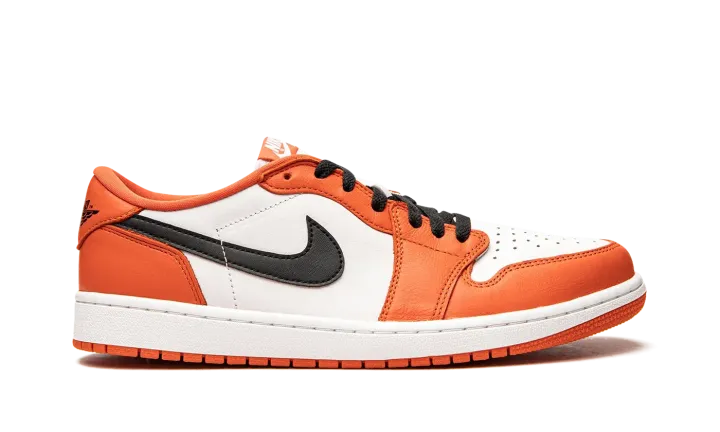 The Air Jordan 1 Low OG "Starfish" is an August 2021 release of Michael Jordan's first signature shoe in low-top form that pays tribute to a now-classic colorway. The "Starfish," despite its nickname, gives a nod toward the Air Jordan 1's popular "Shattered Backboard," specifically the "Reverse Shattered Backboard" Jordan 1 from 2016, with its black, white, and orange color scheme. Also, the Air Jordan 1 Low OG is a near one-to-one remake of the original version of the low-top basketball shoe from 1985. As for the "Starfish," white leather appears on the perforated toe and mid-panel. Contrasting Starfish-colored leather is found on the overlaid panels. A black leather Swoosh appears on both sides. The placement of the black "Wings" logo on the heel is a true-to-original design element of the Air Jordan 1 Low OG. Black laces contrast the white nylon tongue and the Starfish tongue tag with white "Nike Air" branding. Release date: August 26, 2021