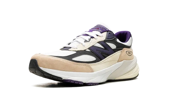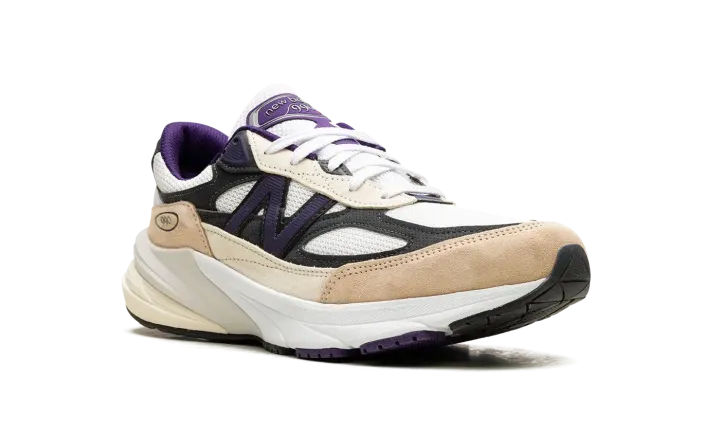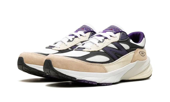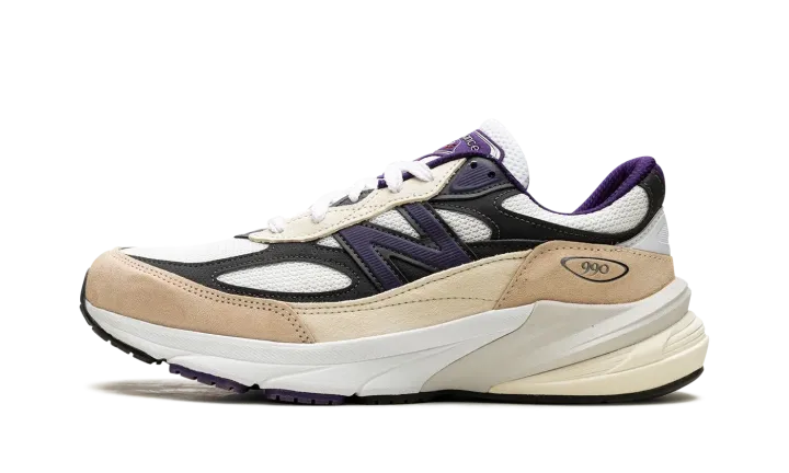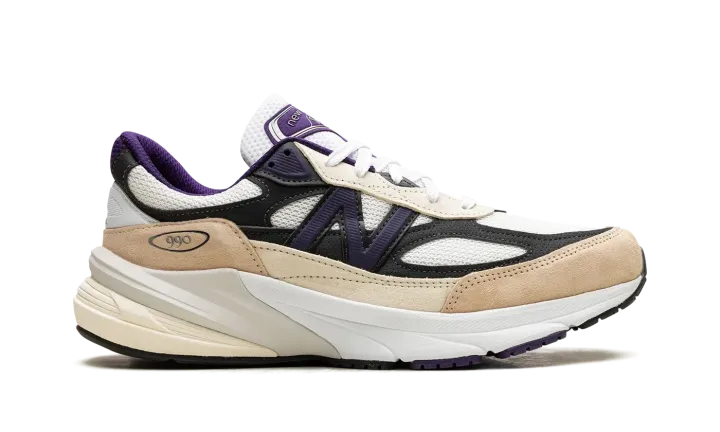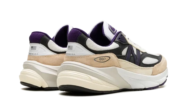 The New Balance 990v6 Made in USA "White/Black/Plum" is a colorway of the casual sneaker by the Boston-based shoe brand with a head-turning look. The shoe's upper is complete with a white mesh construction and black leather and tan suede overlays. An Plum "N" logo can be found on both sides of the shoe. Signature "990" branding appears on the lateral side of the heel while "New Balance 990 v6" detailing can be found on the tongue. New Balance's ABZORB cushioning with FuelCell and ENCAP technology is embedded in the shoe's midsole.