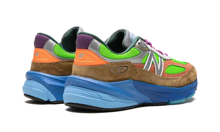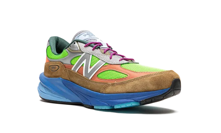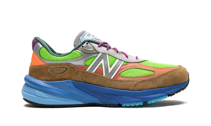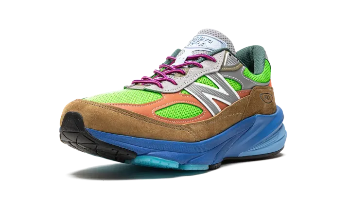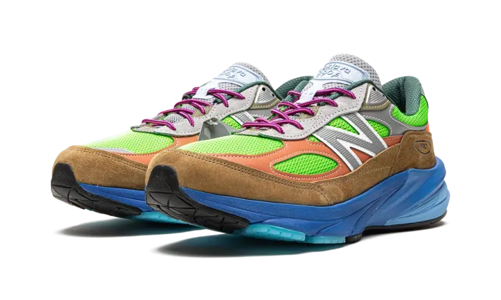 The Action Bronson x New Balance 990 V6 "Baklava" is a collaboration by the New York based hip-hop artist on the popular lifestyle shoe. Memorably worn by Action Bronson during his appearance at an AEW wrestling match in September 2022, the New Balance 990 V6 "Baklava" is the chef, rapper, and entertainer's debut sneaker collaboration with the Boston footwear brand. The shoe features a neon yellow mesh base with a tan suede mudguard overlay. Contrasting reflective leather overlays are found on the toe and collar. Camel-colored leather paneling is located on the sides near the grey "N" branding. Dual branding is found on the insole. Underfoot, the shoe rides on a blue midsole. Release date: March 17, 2023