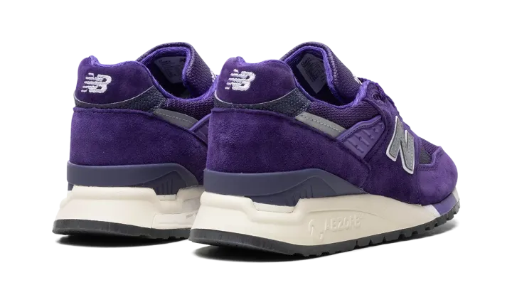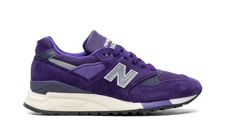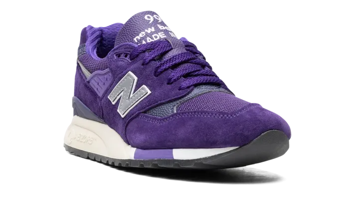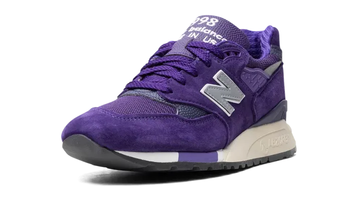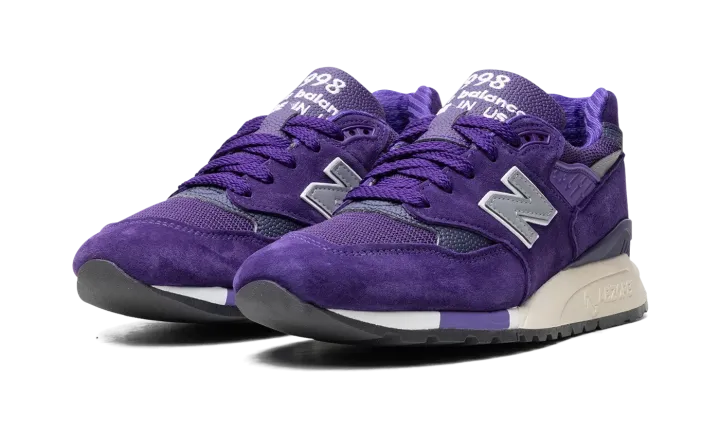 The New Balance 998 "Made In USA - Purple" is a head-turning, purple suede colorway of the retro running shoe from Teddy Santis's "Made in USA" collection with New Balance. The 998 joined the brand's "Made in USA" line in 2023 under Teddy Santis's guidance. Here, the "Purple" colorway features a purple mesh construction with tonal suede and leather overlays throughout. A grey "N" logo appears on each side. "New Balance 998 Made in USA" branding is embroidered on the purple suede tongue. The midsole features ABZORB cushioning for all-day comfort. Release date: June 29, 2023