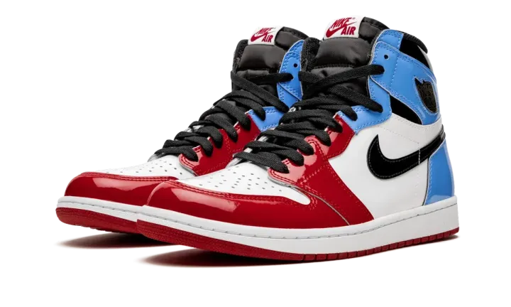 The Air Jordan 1 "Fearless" colorway celebrates the tenth anniversary of Michael Jordan's basketball Hall of Fame induction speech in 2009. Dressed in premium patent leather on its upper, the shoe combines the beloved "UNC" and Chicago Bulls colors in a split fashion. The fusion colorway features a white patent leather base on the mid-panel with a white perforated toe. Red overlays appear on the forefoot and toe cap with Carolina blue patent leather spanning the ankle and heel. Contrasting the look is a glossy black patent leather Swoosh on the mid-panel with a black Air Jordan wings logo with gold accenting sitting on the collar. Unique to this design, a graphic that says "Limits, like fear, are often just an illusion," with a line through the bold word "FEAR," appears on the insoles. Completing the look of the Jordan 1 "Fear" is a white rubber midsole with a bold red outsole. Release date: November 2nd, 2019.