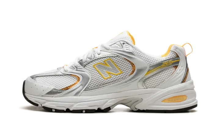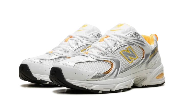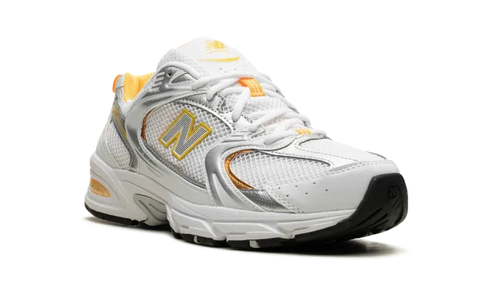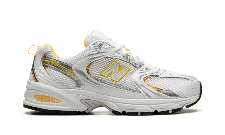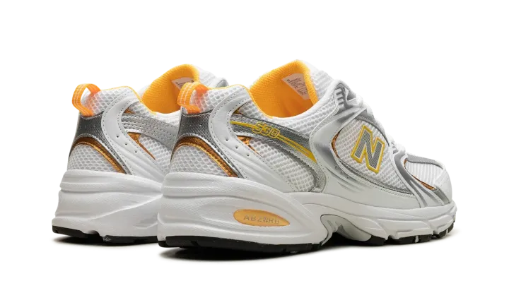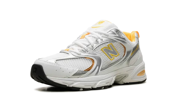 The New Balance 530 "White/Vibrant Apricot" is a colorway of the retro running shoe with colorful details. The New Balance 530 debuted in 1992 as a running shoe before transitioning into New Balance's lifestyle category in the present day. The colorway at hand features a white open-mesh upper with metallic leather overlays accented in an eye-catching Vibrant Apricot hue. A white "N" with Vibrant Apricot-colored trim appears on the sides, while a "530" logo can be seen on the lateral side of the heel. Classic "NB" detailing is embroidered on the tongue. The shoe's chunky midsole is equipped with New Balance's signature ABZORB cushioning for all-day comfort.