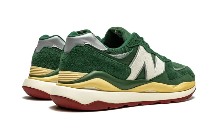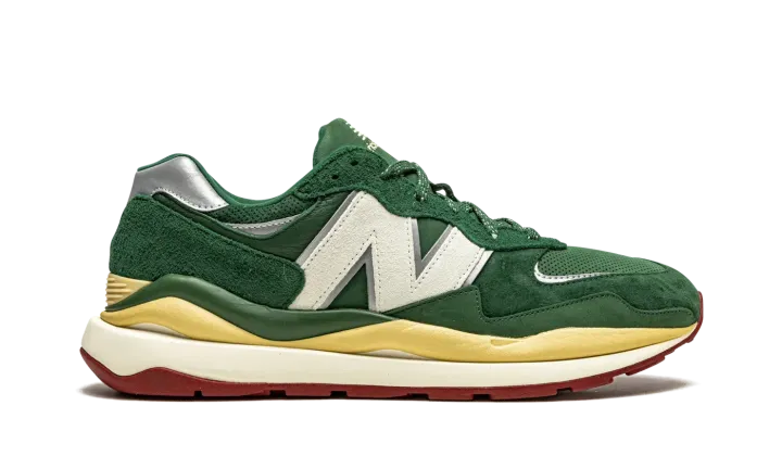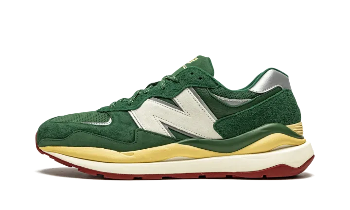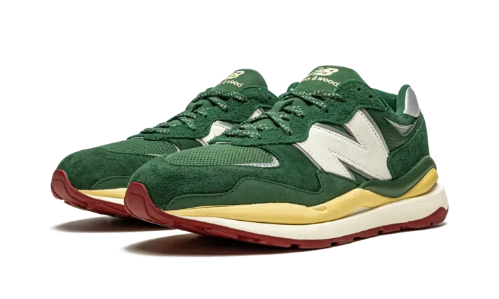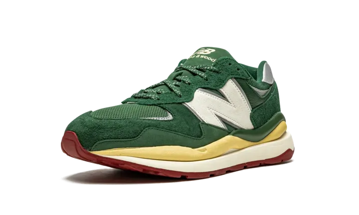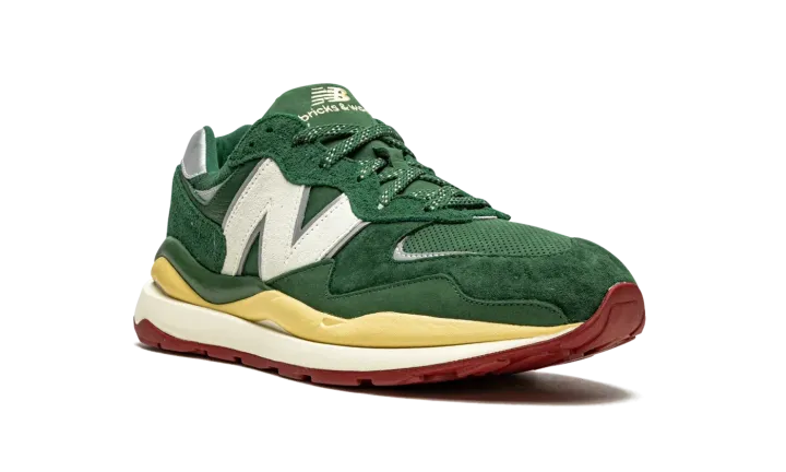 The Bricks & Wood x New Balance 57/40 is a collaboration between the South-Central Los Angeles based streetwear brand and New Balance on the retro-modern lifestyle shoe. Inspired by the New Balance 574, the 57/40 updates the silhouette with retro-inspired finishes. Bricks & Wood adds a premium flair to the shoe that includes hairy Forest Green suede panels on the forefoot, eyelets, and heel. Tonal mesh and leather can be found on the toe and mid-panel, respectively. A cream leather "N" resides on either side of the shoe and dual "NB" and "Bricks and Wood" branding is embroidered on the green suede tongue. Forest Green laces with reflective detailing appear on the tongue and a reflective silver panel on the heel tab shines when exposed to light in the dark. The layered pre-yellowed rubber midsole is stacked on top of a white midsole for a retro-future look. Release date: June 4, 2021