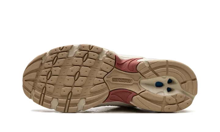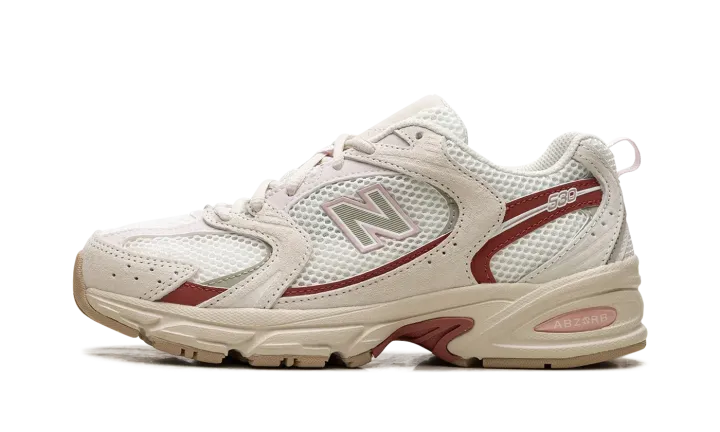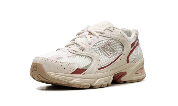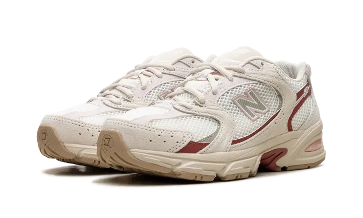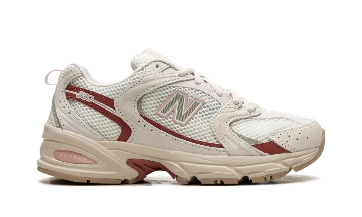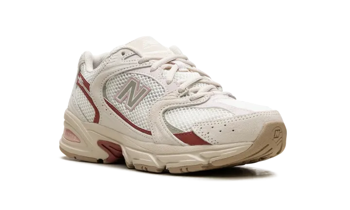 The New Balance 530 "Festivals" is a colorway of the retro running shoe with bright details inspired by the positive energy of music festivals. From a greater collection of "Festival" colorways by New Balance, the shoe at hand features an off-white mesh construction with tonal suede overlays accented in a brick red hue. An olive "N" logo outlined in pink appears on the lateral side, while a pink "530" logo appears on the lateral side of the quarter panel. The insole features a graphic of a sunset behind a silhouette of a line of palm trees. Release date: March 29, 2024