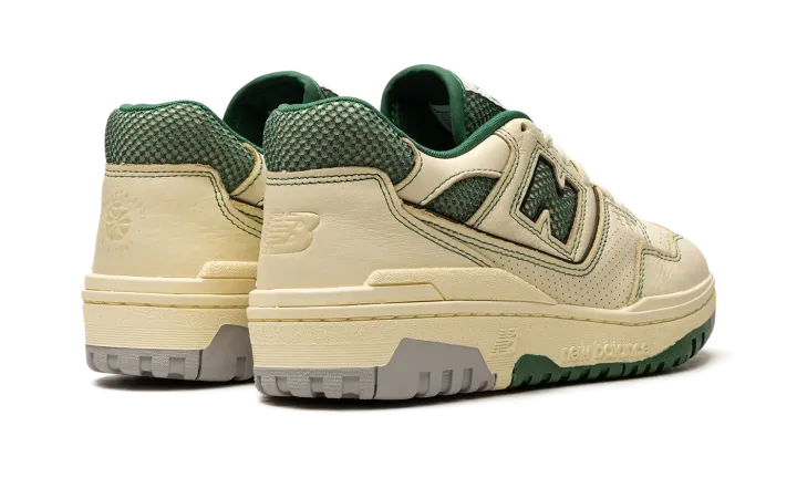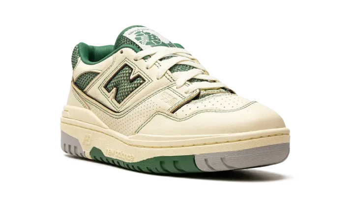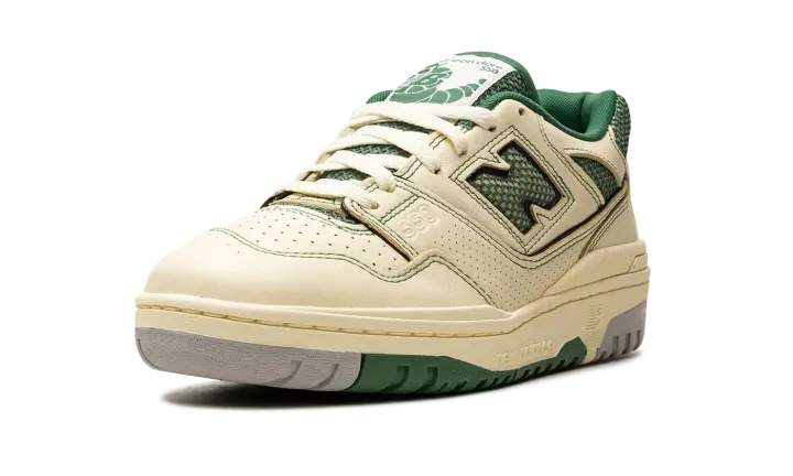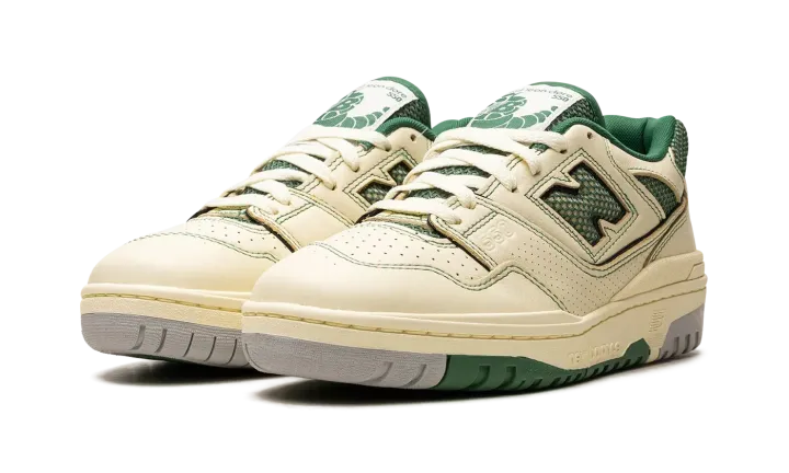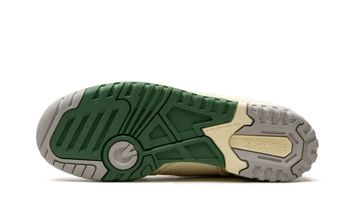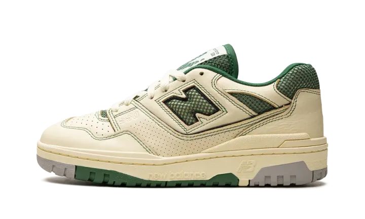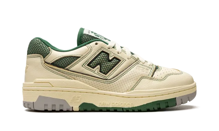 The Aimé Leon Dore x New Balance 550 "Masaryk Community Gym - Green" is a collaboration by Teddy Santis's clothing brand on a colorway of the retro basketball shoe with green features. Aimé Leon Dore and New Balance draw inspiration from New York's Masaryk Community Gym" on this version of the old school hoops shoe. The upper features a Dawn Glow (a yellowish-cream hue) leather construction with green mesh "N" branding outlined in black on the sides. "Aimé Leon Dore" branding can be seen on the tongue while co-branding appears on the heel. A cream midsole and a grey and green outsole complete the look.
