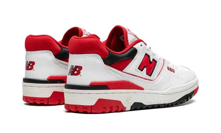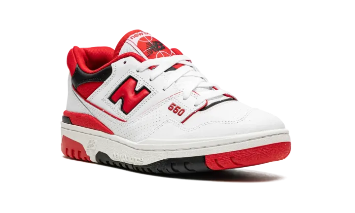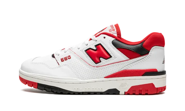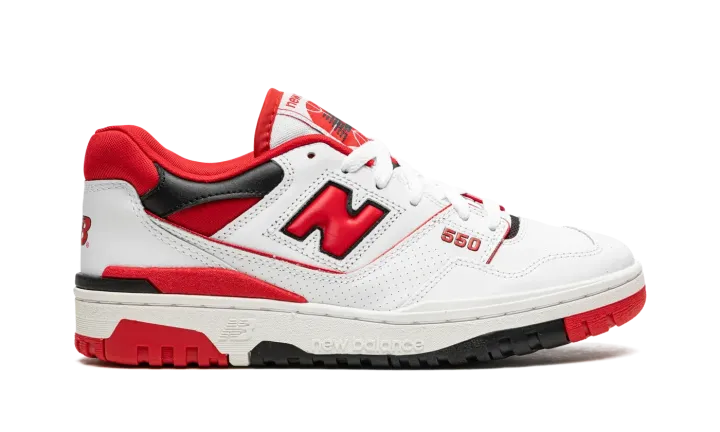 The New Balance 550 "White/Red/Black" is a retro-inspired colorway of the vintage basketball shoe that has been featured in popular collaborations with Aimé Leon Dore and Joe Freshgoods. Since returning on the scene in 2020 after spending the years prior in the vault, the New Balance 550 has become one of the brand's most desirable shoes. The "White/Red/Black" features a white perforated upper with a red "N" branding on the sides. Black leather detailing is found on the red neoprene collar. A red "550" logo is embroidered on the forefoot. Additional branding includes an "NB" logo on the heel and retro-inspired "New Balance 550 USA" detailing on the tongue. A chunky white rubber midsole is contrasted with a black and red outsole.