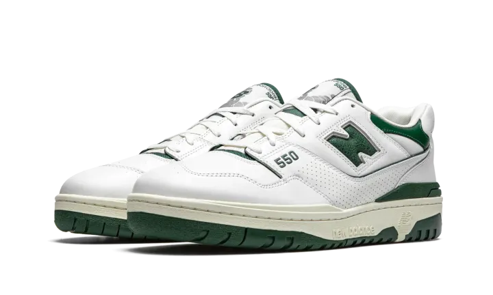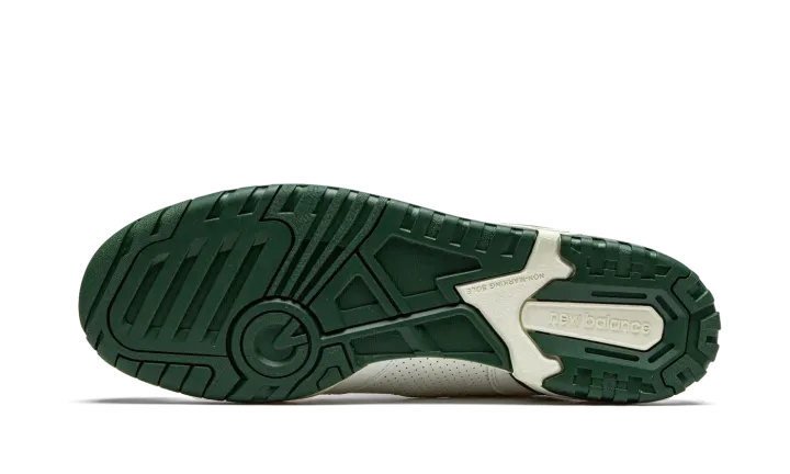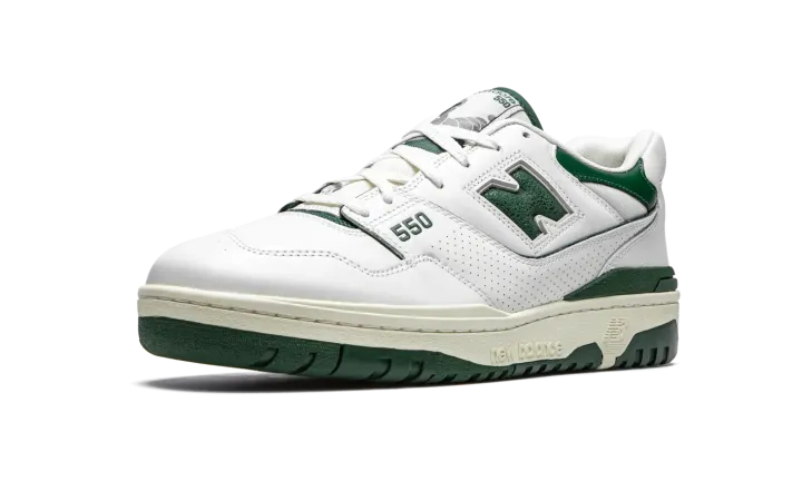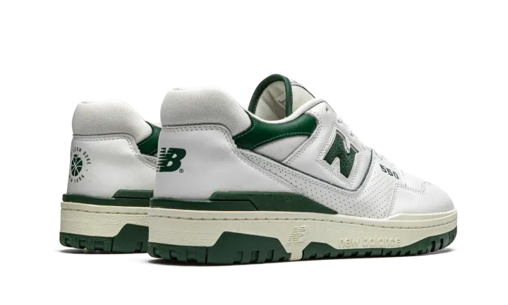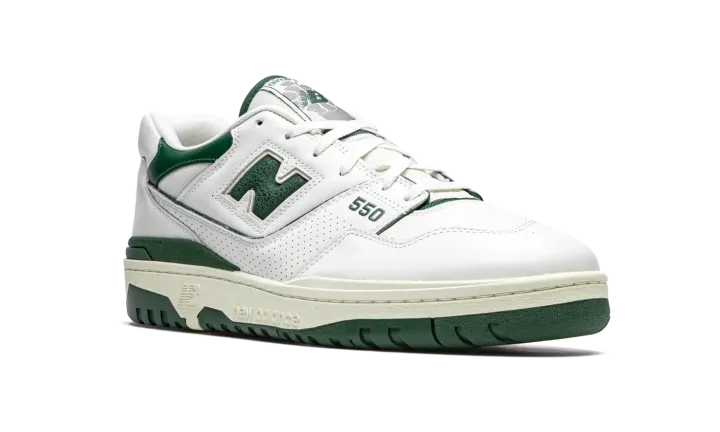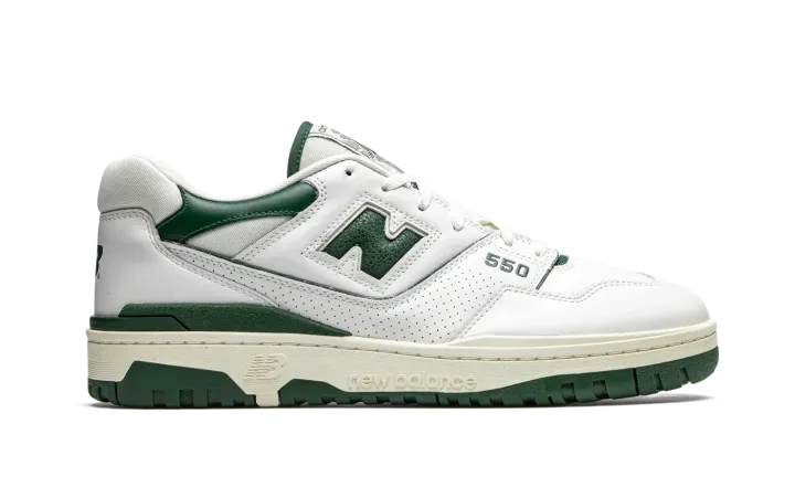 The Aime Leon Dore x New Balance 550 "Green" is one of four white-based colorways of the retro performance basketball silhouette brought back by the New York City streetwear brand in October 2020. The 550 model originally debuted in 1989 as part of New Balance's performance footwear program. Never tied to one player, the shoe nonetheless remained largely unheralded, forgotten even, until Aime Leon Dore worked with New Balance to re-release it for Fall 2020. The retro design features a mixture of smooth and dotted white leather on the upper. Green accenting on the "550" insignia on the forefoot and "N" branding on the mid-panel add a subtle pop of color against the white background. Dual Aime Leon Dore and "NB" detailing can be found on the back of the left and right shoe, respectively. Additional design elements include green molding on the heel and green leather on the collar. The pre-yellowed midsole is a nod to the nostalgic vibe of the New Balance 550. Release date: October 9, 2020.