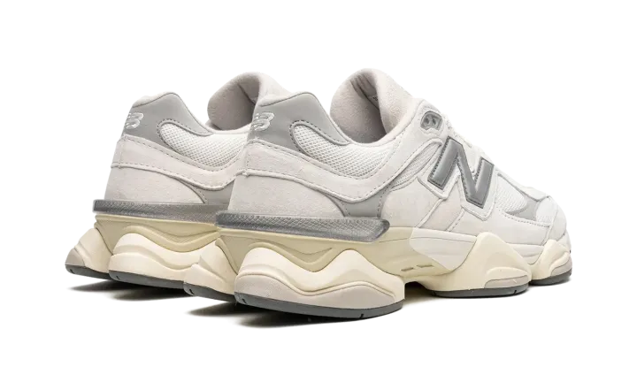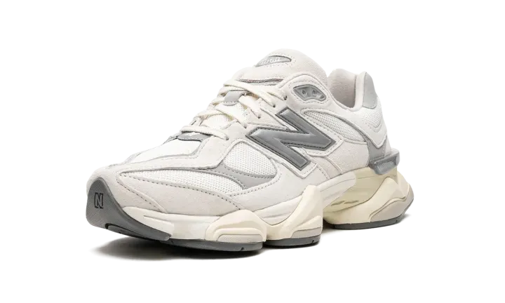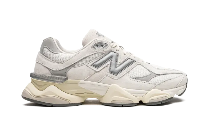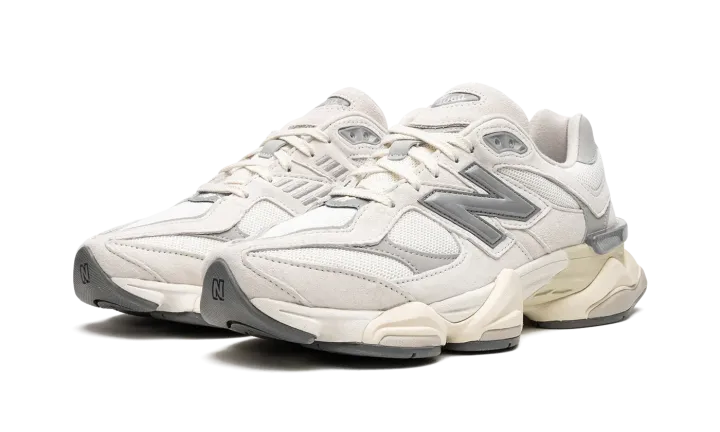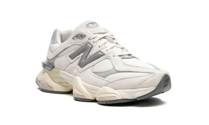 New Balance continues to innovate with models like the 9060. This "White/Grey" colorway offers a minimalist aesthetic with neutral tones. White suede and breathable mesh form the upper, complemented by a vintage-inspired midsole and laces. Grey and silver accents enhance the design, notably on the "N" logo and outsole. Experience New Balance's contemporary sneaker design.