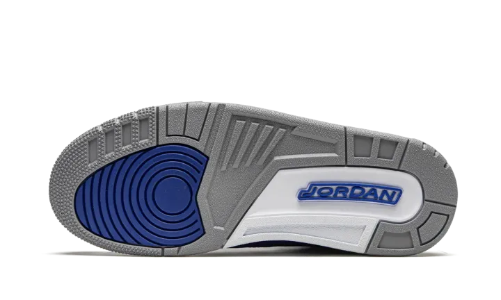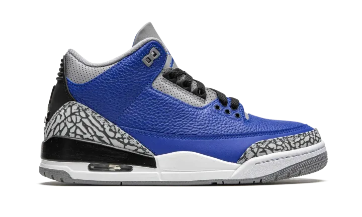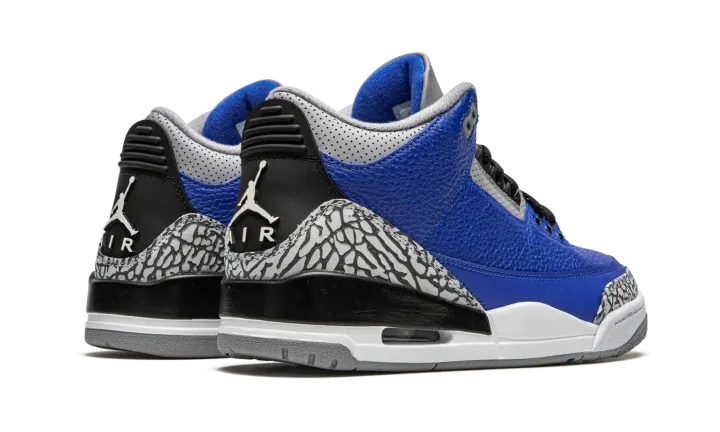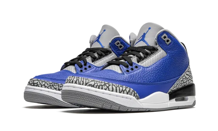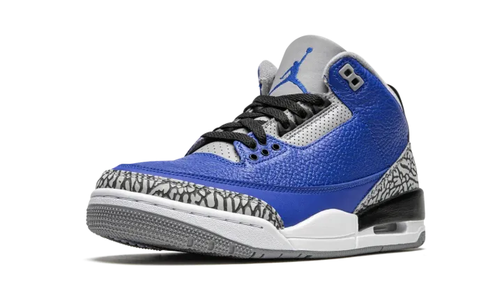 The Air Jordan 3 "Blue Cement" is a desirable non-original colorway of Michael Jordan's third signature shoe that was released in Fall 2020. Dressed in a color scheme reminiscent of the "Red Cement" Jordan 3 that debuted to much fanfare during the NBA's All-Star Weekend in 2020, the "Varsity Royal" plays up on the silhouette's throwback styling while remaining fresh in every aspect of its design. Appearing in the same color block of the "Black/Cement" colorway, the upper swaps black tumbled leather with Varsity Royal leather. The iconic elephant print panels are found on the toe and heel. White Jumpman detailing appears on the heel and an Air window in the heel of the midsole helps retain the original look of the Jordan 3. Release date: October 10, 2020.