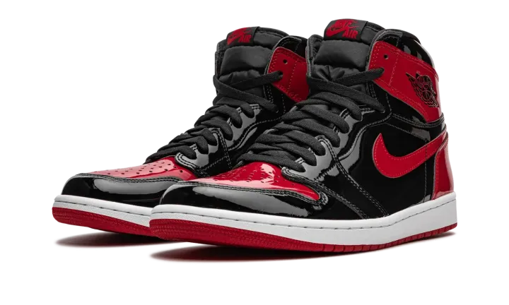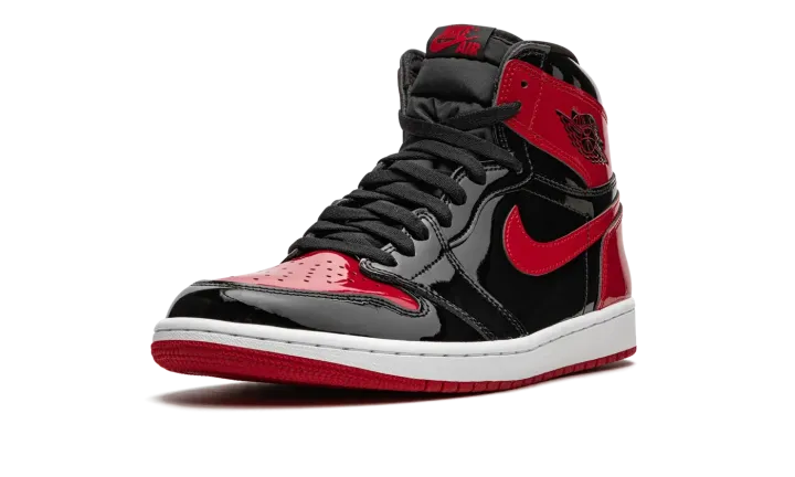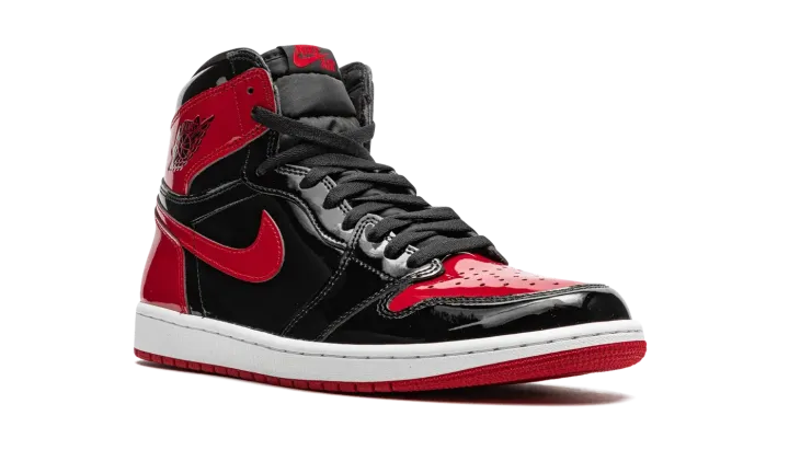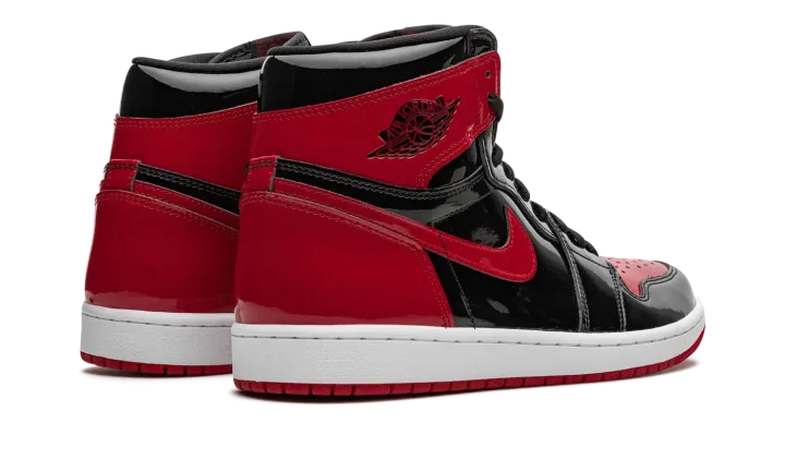 The Air Jordan 1 High OG "Patent Bred" updated an original colorway of Michael Jordan's first signature shoe with a patent leather finish. Based on the iconic "Bred" colorway, the aptly named "Patent Bred" features a modified patent leather construction. Much like the original "Bred," Varsity Red leather detailing can be found on the perforated toe, collar, heel, and Swoosh, though in patent leather. Black patent leather forms the base. A black "Wings" logo can be found on the collar and red "Nike Air" detailing appears on the black nylon tongue tag on the black nylon tongue. A white rubber midsole and Varsity Red-colored outsole complete the look.