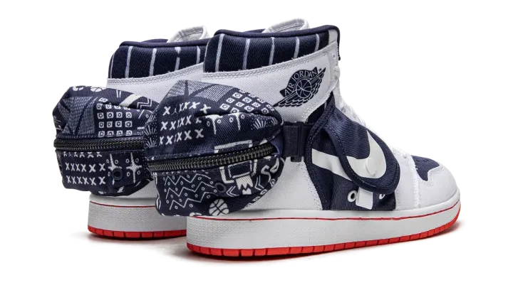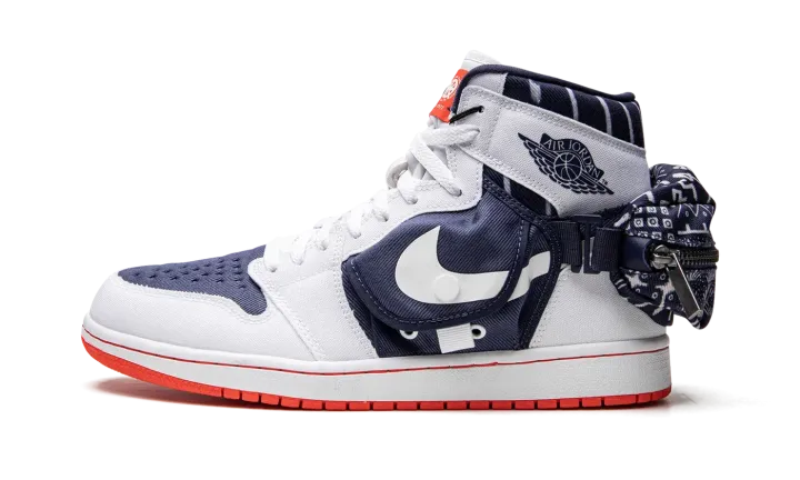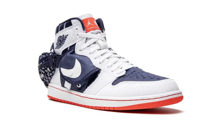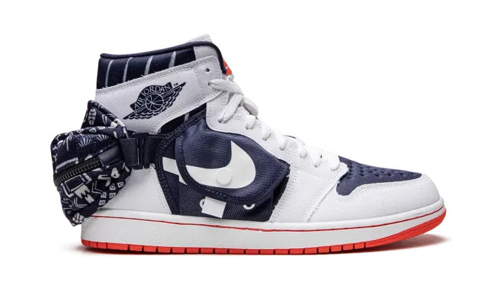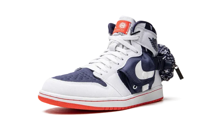 The Air Jordan 1 High Utility "Quai 54" is the modified version of the retro basketball shoe in a colorway that honors the Parisian streetball tournament. The Jordan 1 High Utility progresses Michael Jordan's first signature shoe with multiple storage pockets, including a stash pocket on the mid-panel and on the heel. On this "Quai 54" colorway, the shoe is designed with a navy textile base with white canvas overlays. A snap-button stash pouch appears on both sides. A third pocket with a zip closure is found on the back of the shoe. Dual "Quai 54" and Jumpman branding appear on the orange nylon tongue tag. Underfoot, a white rubber midsole and orange sole complete the look. Release date: August 30, 2022