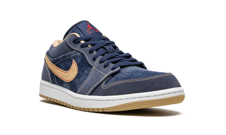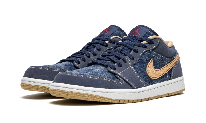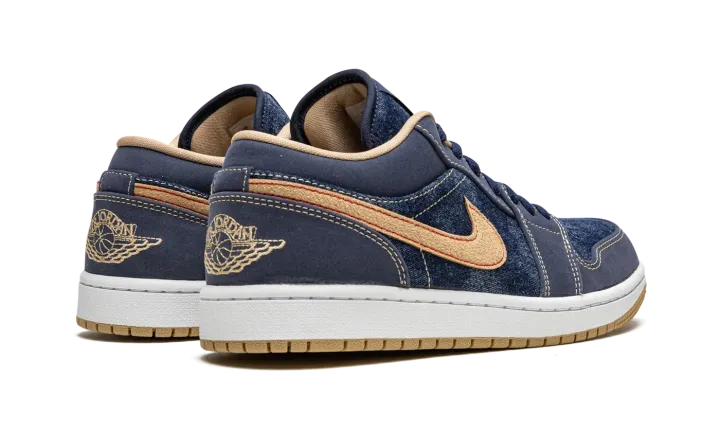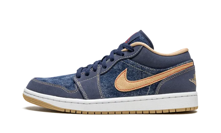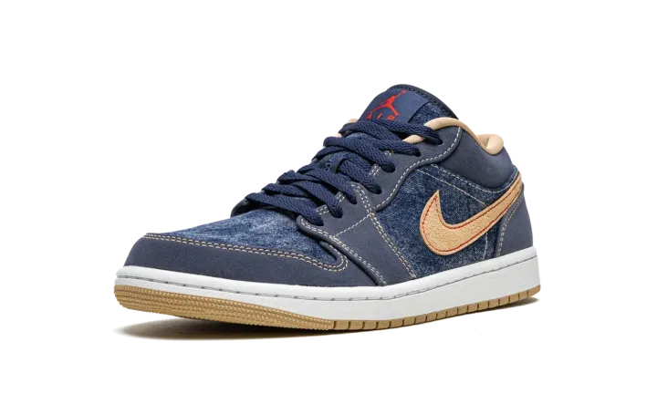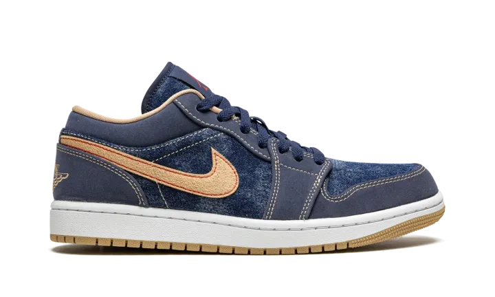 The Air Jordan 1 Low SE "Denim" is a unique look for the low-top version of Michael Jordan's first signature that features a denim construction. Skewing toward the casual lifestyle category, the "Denim" edition of the vintage basketball shoe is complete with a durable blue denim base and Midnight Navy nubuck overlays. A tan suede Swoosh appears on either side of the shoe and a tan Wings logo is embroidered onto the heel. Additional branding appears in the form of a red Jumpman with "Air" on the tongue. A blue "23" logo is embroidered on the lace overlay. The inner lining appears in the same beige color as the Swoosh and "Wings" logo.