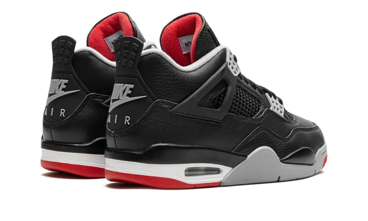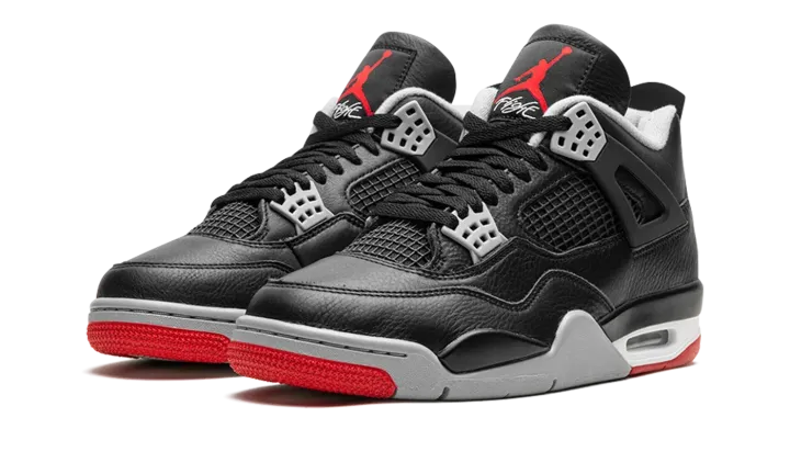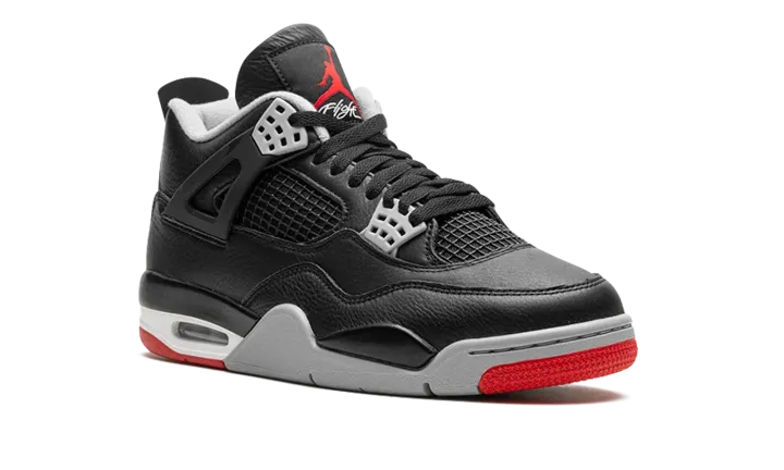 The Air Jordan 4 "Bred Reimagined" is an iconic and original colorway of the fourth Air Jordan sneaker that replicates the model's original design. The "Bred Reimagined" was released by Jordan Brand in February 2024 to celebrate the legendary Jordan 4's 35th anniversary. Dressed in the same color block as the original version from 1989, the "Bred Reimagined" mimics the look of the OG Jordan 4 "Bred" with accurate-to-original panels, colors, and overall shape. However, the design does differ from the original "Bred" Air Jordan 4 by featuring a tumbled leather upper instead of the OG's nubuck construction. Cement Grey plastic eyelets contrast the look on the front of the shoe. On the back, Cement Grey "Nike Air" branding gives the sneaker a classic look. A red Jumpman and "Flight" branding in cursive appear on the tongue tag. A grey and white rubber midsole completes the look. Release date: February 17, 2024