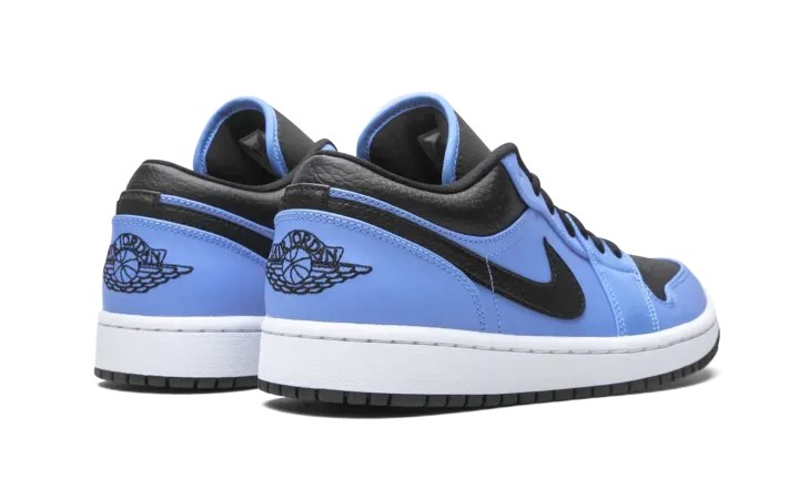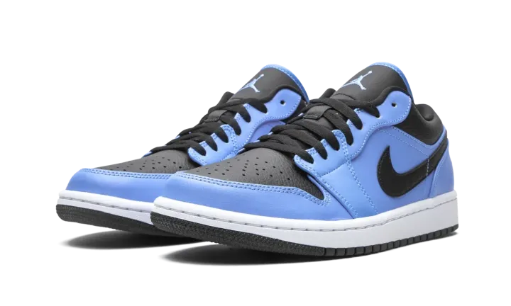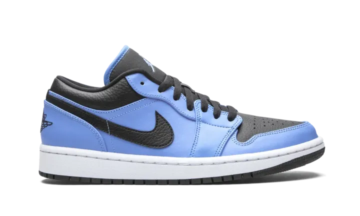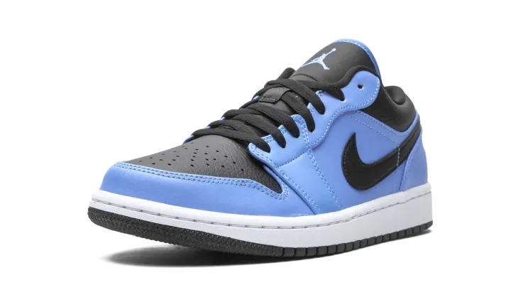 The Air Jordan 1 Low "University Blue/Black" is a collegiate inspired look for the low-top version of Michael Jordan's first signature shoe. The "University Blue/Black" undoubtedly references the UNC Tar Heels by employing the school's shade of light blue in its design. The Carolina Blue hue appears on the leather overlays on the forefoot, eyelets, mid-panel, and heel. Black leather can be found on the toe, collar, and Swoosh branding on either side of the shoe. Elsewhere, a black embroidered "Wings" emblem is stitched onto the heel and a University Blue Jumpman appears on the black nylon tongue. Jordan Brand finishes off the look with a white midsole and contrasting black outsole.