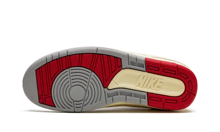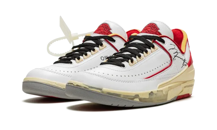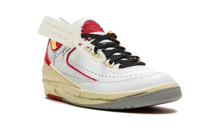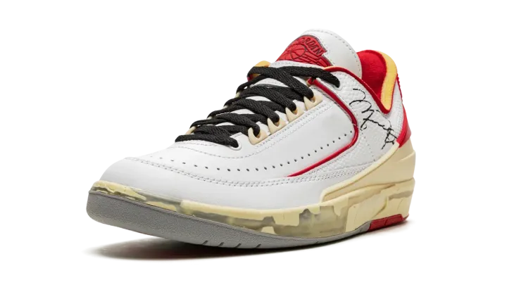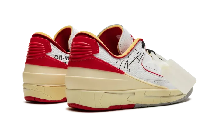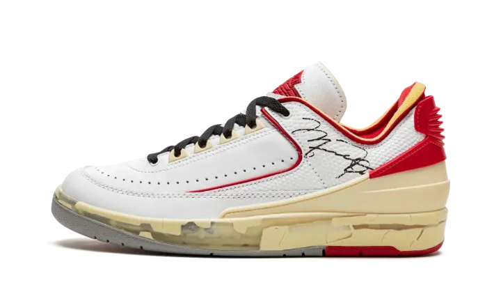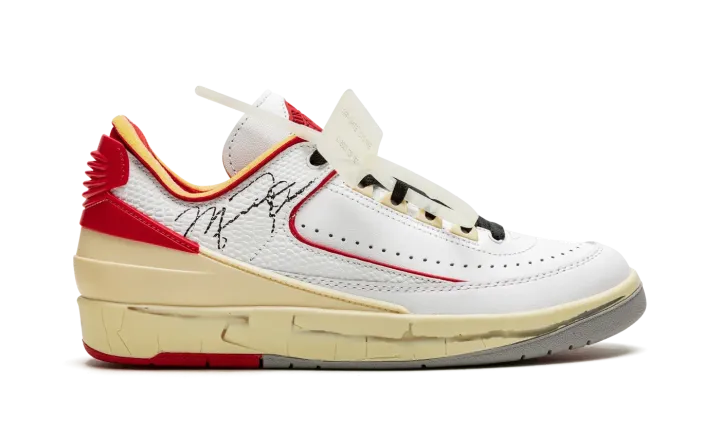 The Off-White x Air Jordan 2 Low OG "Chicago" is a collaboration between Virgil Abloh's high fashion and streetwear brand and Jordan Brand on a vintage-inspired colorway of Michael Jordan's second signature shoe. Off-White's Air Jordan 2 Low honors the classic retro basketball shoe's 35-year anniversary by reimagining the model's original "Chicago" colorway in the brand's popular "new-vintage" aesthetic. Modifications to the design of the Air Jordan 2 Low by Off-White include a pre-yellowed, pre-"cracked" midsole that replicates the look of crumbled soles associated with original 1987 pairs of the Jordan 2. The upper is constructed from white tumbled leather. Industrial-style Off-White branding is stamped onto the medial side of the shoe. Michael Jordan's signature appears on the collar of the lateral side. Red "Wings" branding resides on the white leather tongue and Off-White's signature "SHOELACES" detailing can be found on the black laces. The exposed foam padding found on the collar is consistent with the styling of Off-White's Air Jordan collaborations.