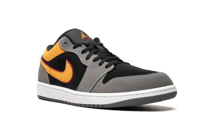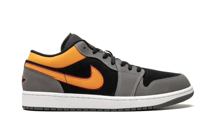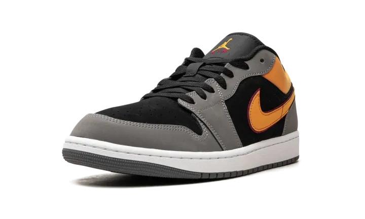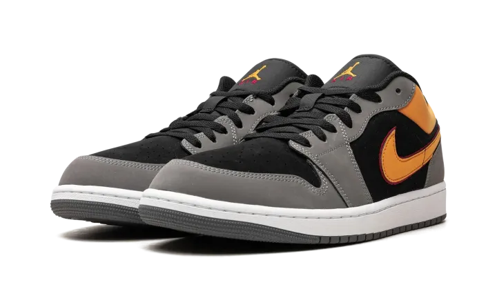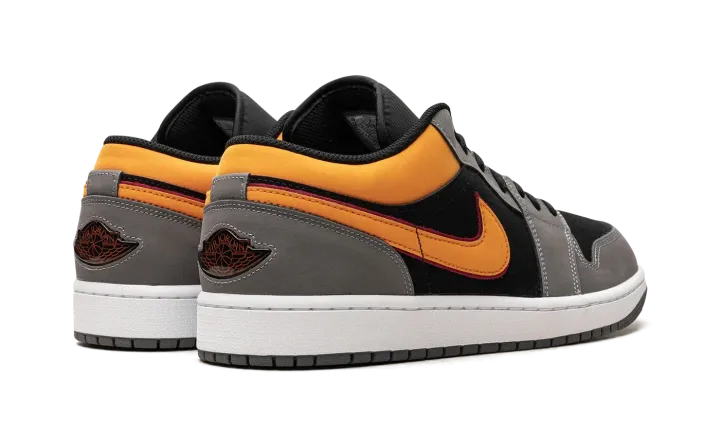 The Air Jordan 1 Low "Vivid Orange" is a colorway of the retro basketball shoe that stands out with eye-catching orange accents. The upper features a black synthetic nubuck base with Light Graphite overlays. A leather Vivid Orange Swoosh is located on either side of the shoe, matching font found on the "Wings" logo on the heel. More Vivid Orange accenting is seen on the collar and Jumpman logo on the tongue. A white rubber midsole and black rubber outsole complete the look. Release date: August 29, 2023