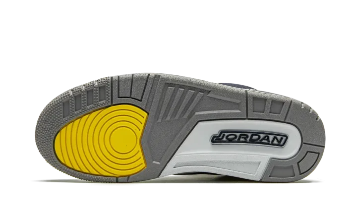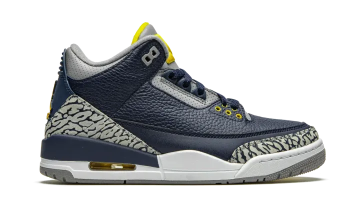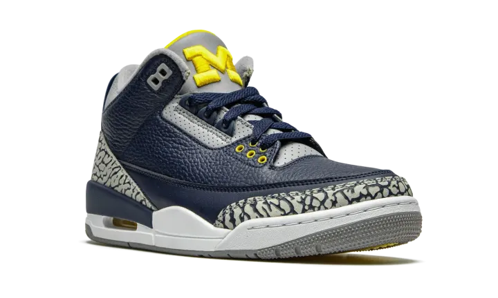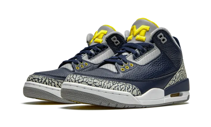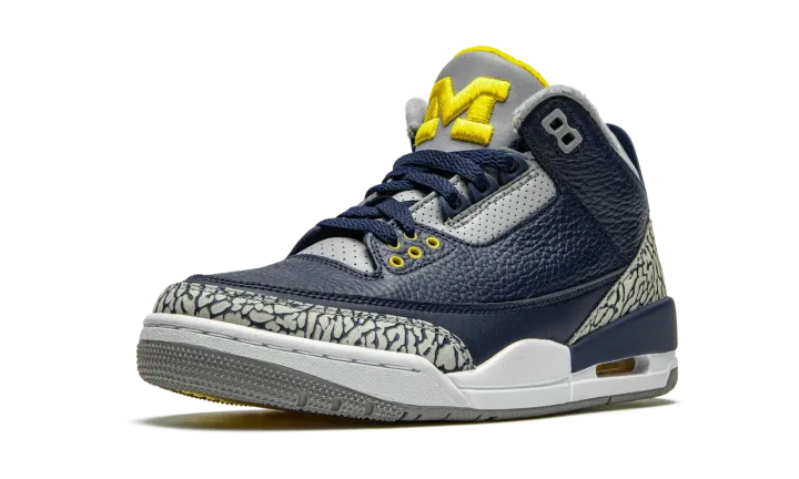 The Air Jordan 3 PE "Michigan Wolverines" is an unreleased sample colorway of the vintage basketball shoe that was created for the Michigan Wolverines college football team for its appearance in the 2018 Outback Bowl. The Michigan Jordan 3 is one of several Player Exclusive colorways created for the Wolverines by Jordan Brand. The shoe features Midnight Navy leather construction with classic elephant print on the toe and heel. Embroidered "M" logo detailing is found on the tongue and classic Jumpman branding appears on the heel. "Michigan" and "Football" are printed on the underside of the left and right tongues, respectively. A painted navy mudguard and white foam midsole with visible Air cushioning completes the look.