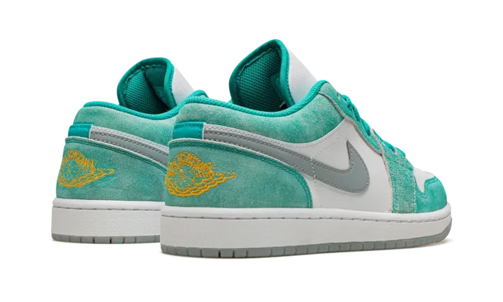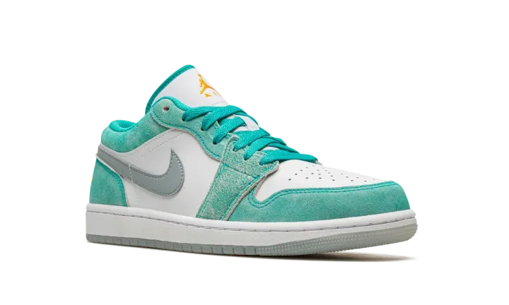 The Air Jordan 1 Low SE "New Emerald" is a clean look for the popular lifestyle shoe meant for casual wear. The "New Emerald" features white leather on its perforated toe and mid-panel. Contrasting New Emerald suede overlays contrast the neutral-colored base. A silver leather Swoosh appears on either side of the shoe while yellow "Wings" branding is embroidered on the heel. Both the Jumpman and "Air" logos on the white leather tongue are also designed in yellow. A two-tone, white midsole and grey rubber outsole completes the look. Release date: July 14, 2022