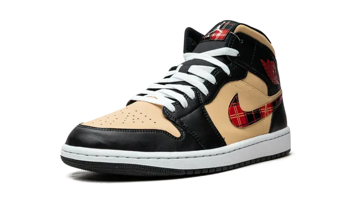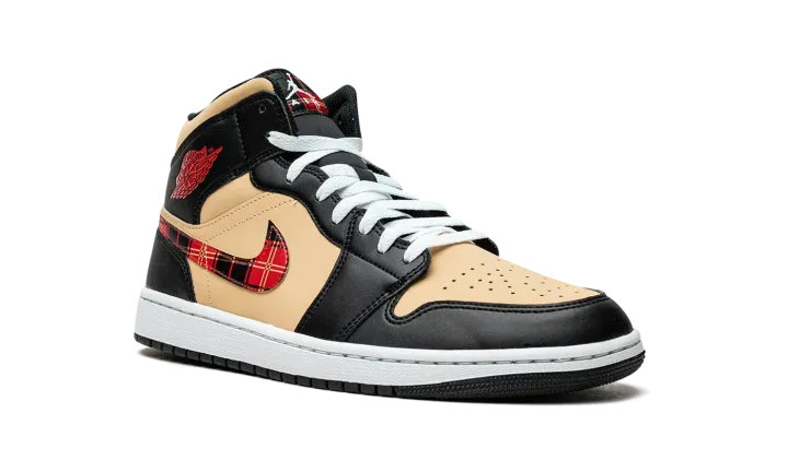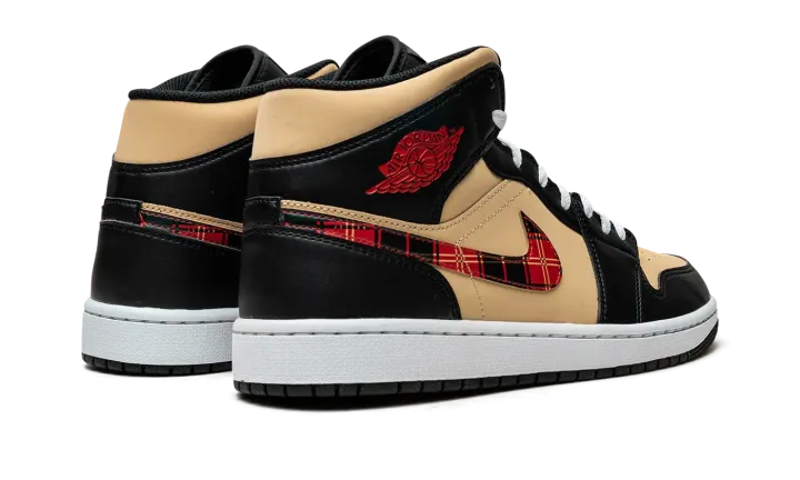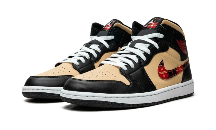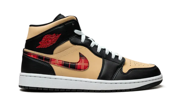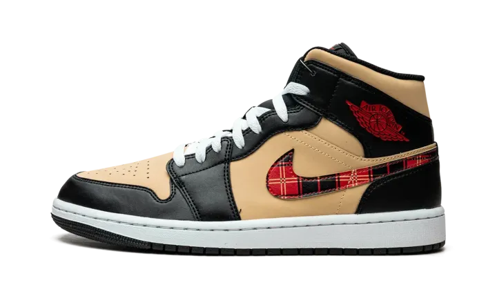The Air Jordan 1 Mid "Tartan Swoosh" is a unique colorway of the popular lifestyle shoe with a tartan plaid Swoosh. Like its name suggests, the "Tartan Swoosh" updates the Jordan 1 Mid with a plaid Swoosh that gives the shoe a decidedly casual look. The upper features a Sesame-colored leather base with black leather overlays. A red "Wings" logo appears on the collar and a white Jumpman logo is found on the tartan tongue tag. The white rubber midsole is paired with a black outsole.