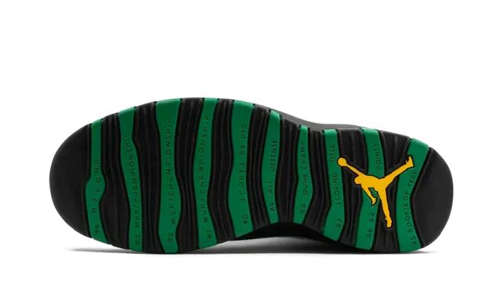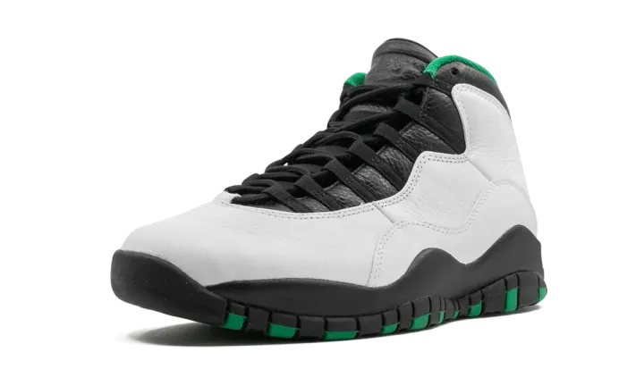The Air Jordan 10 "Seattle Supersonics" is an original colorway of the '90s-era Jordan 10 model that features the team colors of the beloved former Seattle Supersonics NBA basketball team. Originally released back in 1995 as a part of Nike's "City Series" of Air Jordan 10 colorways that honored specific NBA franchises including Charlotte, Orlando, New York, and Sacramento, the "Seattle" makeup is arguably the most legendary of the pack. Interestingly enough, a year after its release, it would be in fact the Sonics that Michael Jordan and the Bulls would defeat to win the 1996 NBA Championship. As for the sneaker, the "Sonics" Air Jordan 10 features a white leather base with contrasting black leather appearing on the eyelets and ankle collar. Accenting the upper is a plush green inner lining. Finishing touches include a black rubber midsole with the model's traditional striped outsole with Sonics-specific green and yellow accents. Release date: October 19th, 2019.
