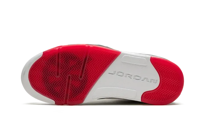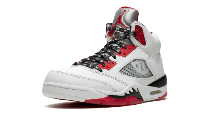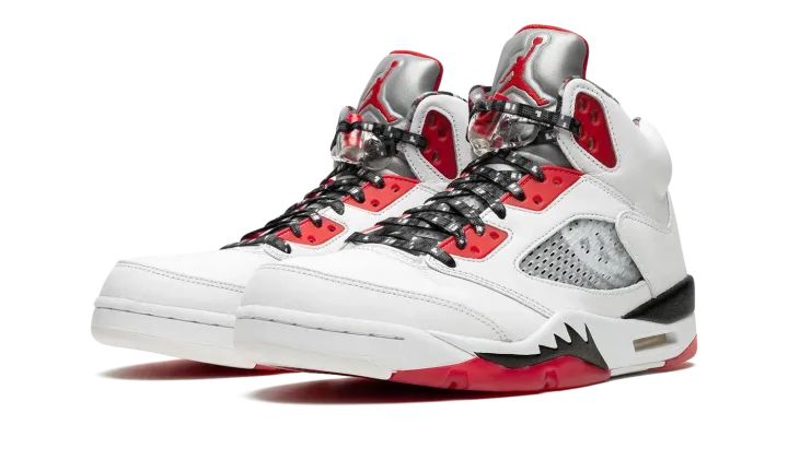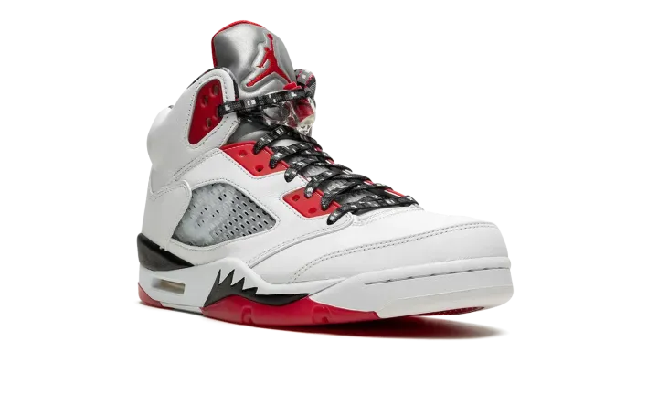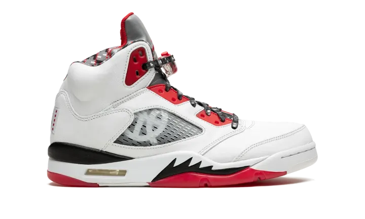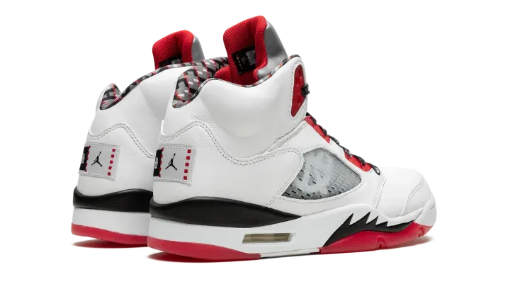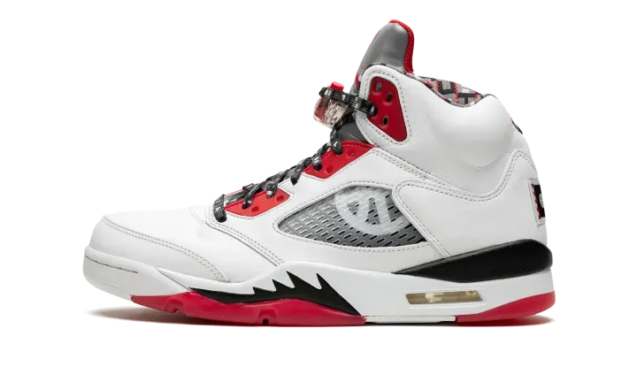 White/red leather Air Jordan 5 Retro Q54 from JORDAN featuring signature Jumpman motif, contrasting panel detail, round toe, front lace-up fastening, ankle-length, branded insole and rubber sole. These styles are supplied by a premium sneaker marketplace. Stocking only the most sought-after footwear, they source and curate some of the most hard to find sneakers from around the world..