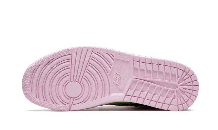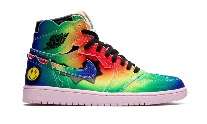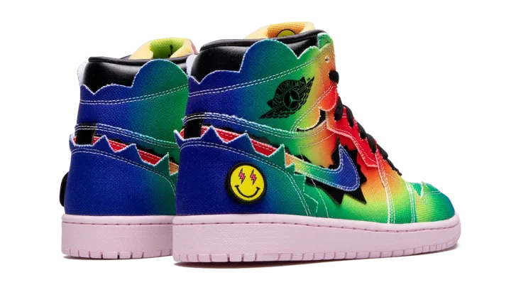 The J Balvin x Air Jordan 1 High OG "Colores Y Vibras" is a Holiday 2020 collaboration between the popular Latin artist and Jordan Brand on Michael Jordan's first signature shoe. With the release of the "Colores Y Vibras," which translates to "Colors and Vibes" in English, the Colombia native becomes the first Latin musician to collaborate with Jordan Brand, a monumental achievement. As for the design, the upper features a canvas construction with a rainbow-like assortment of colors baked into its look. Jagged panels on the collar, eyelets, heel, and forefoot further the singular look of J Balvin's design. Other details include multicolor sewn-on Swooshes on either side, a black "Wings" emblem on the collar, and a pink nylon tongue with mismatching tongue tags that feature an orange patch with a black Jumpman on the right shoe and a green patch with a yellow smiley face on the left shoe. Exposed foam breaks through the top of the jagged collar and the artist's yellow smiley face arrives in patch form on the heel. A light pink sole completes the look of one of most eccentric Air Jordan 1s ever designed. Release date: December 8, 2020.