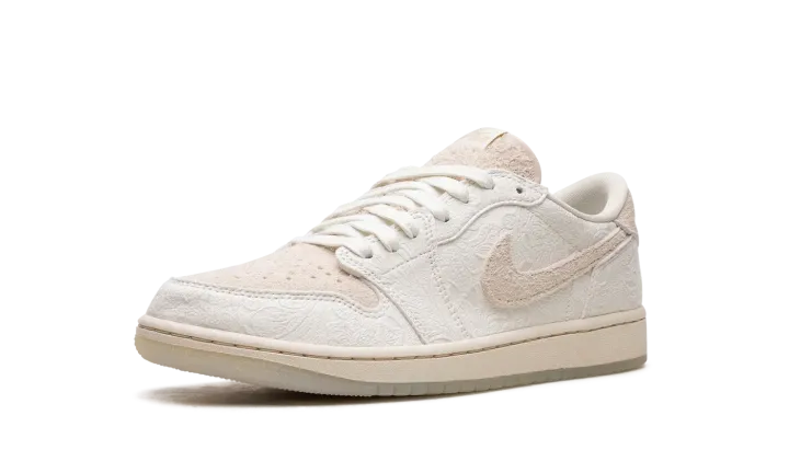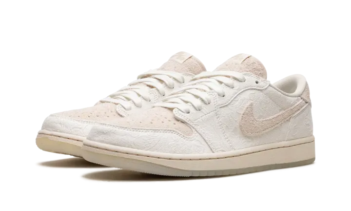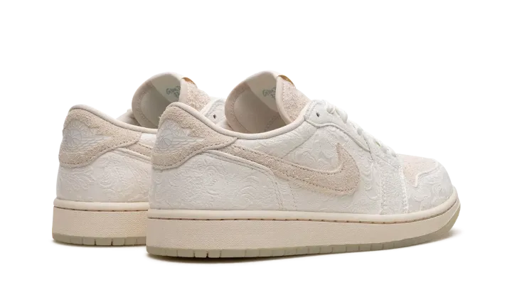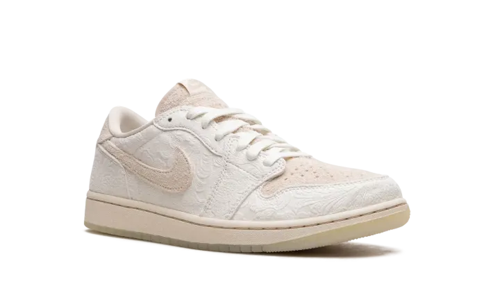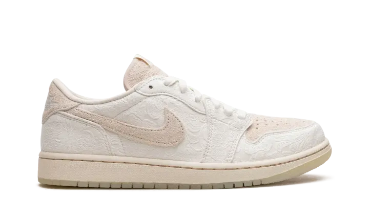 The Chris Paul x Air Jordan 1 Low OG "Give Them Flowers" is a special colorway of the retro basketball shoe inspired by the basketball star's career. Considered one of the best point guards in NBA history, Chris Paul has had as impressive a career as any other player from his era. On the Jordan 1 Low OG "Give Them Flowers," Jordan Brand celebrates Paul's achievements by designing Michael Jordan's first signature shoe with an intricate floral pattern texture. An off-white roughout suede material appears on the perforated toe, tongue, and Swoosh, contrasting the rest of the shoe's mostly white upper. Classic "Nike Air" branding appears on the tongue while the phrase "Give Them Flowers" is seen on the inner side of the tongue, and a floral graphic insole completes the theme. Release date: October 24, 2023
