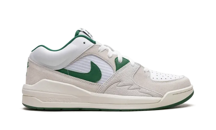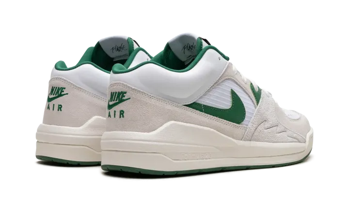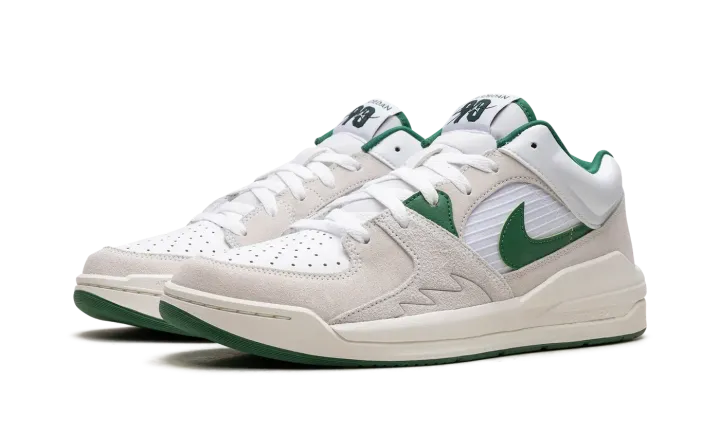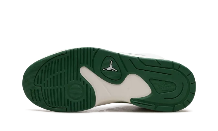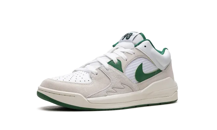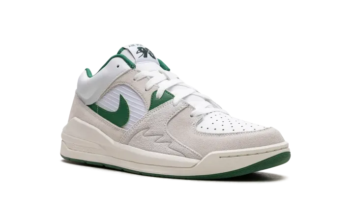 The Jordan Stadium 90 "White/Clover Green" is a clean and timeless colorway of the lifestyle sneaker that combines various design elements of the Air Jordan 5 along with hints of the Air Jordan 1. The shoe is complete with a white netted mid-panel, a white leather perforated toe, and cream hairy suede overlays. A Clover suede Swoosh is found on either side. Retro-inspired "Jordan" branding appears on the tongue. A subtle "shark tooth" detail is debossed on the lateral sides near where the motif is also found on the Jordan 5. Formula 23 cushioning technology in the heel of the cream foam midsole provides a comfortable ride.
