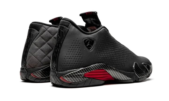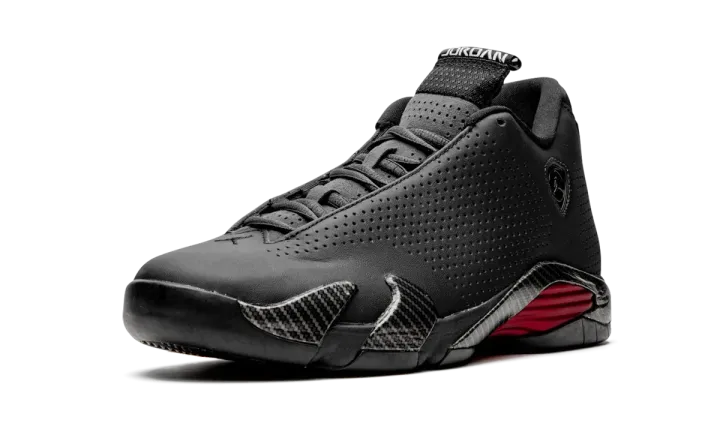 The Air Jordan 14 "Black Anthracite" is Michael Jordan's fourteenth signature design in the collection. The shoe is fittingly dressed in a premium black quilted pattern and perforated leather upper. In addition this silhouette includes a carbon fiber mudguard and rubberized heel guard. The higher cut black tongue is an ode to a car spoiler. This Jordan 14 was released on December 2, 2019.