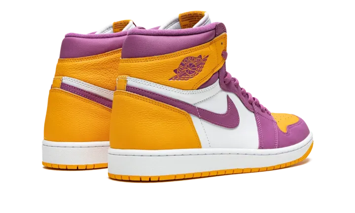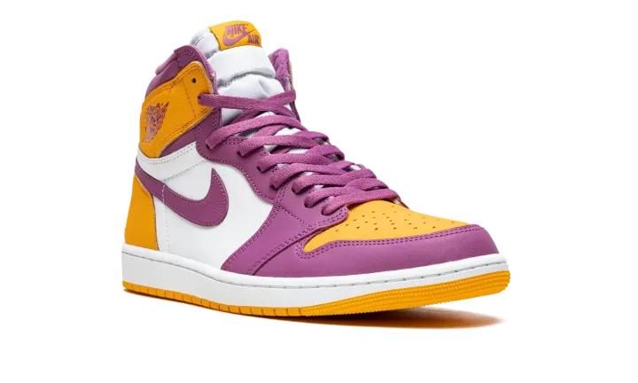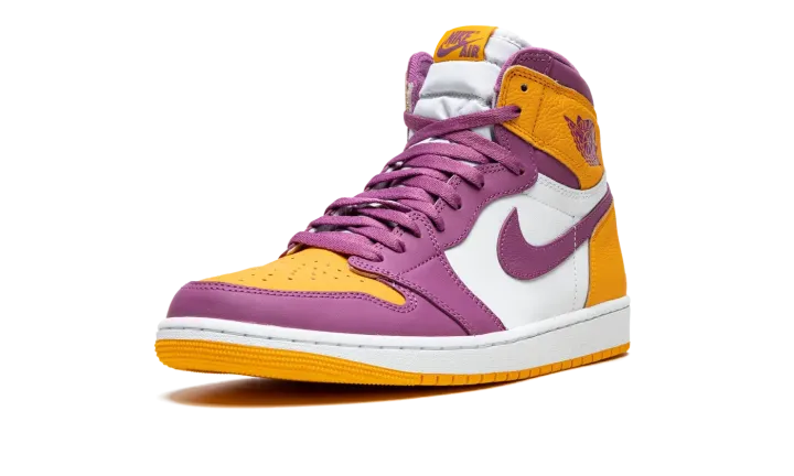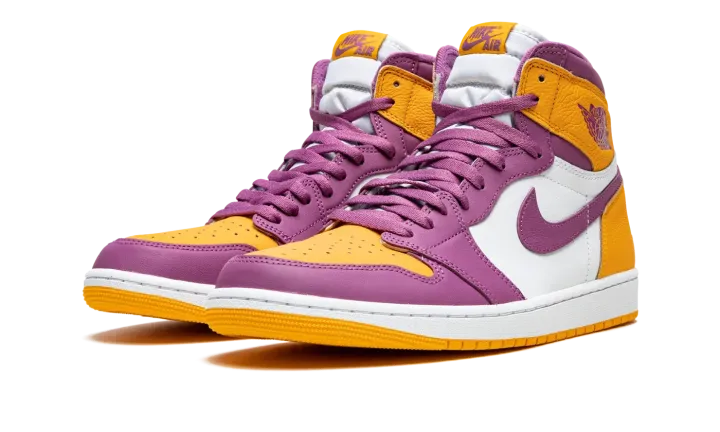The Air Jordan 1 High OG "Brotherhood" is a February 2022 release of the vintage basketball shoe that honors Michael Jordan's Omega Psi Phi fraternity from his alma mater, the University of North Carolina. The "Brotherhood" is yet another Air Jordan colorway that offers a look into Jordan's life, this time drawing inspiration from the fraternity he was a member of while playing college basketball with the Tar Heels. The look of the shoe is inspired specifically by the Omicron Alpha chapter, an African-American fraternity founded in 1911 that has signature colors of purple and University Gold, both of which appear on the shoe. Specifically, the perforated toe, collar, and heel feature University Gold leather while the toe cap, forefoot, eyelets, and laces are dipped in Light Bordeaux. The Swoosh and collar also appear in Light Bordeaux, and a "Wings" logo in black is found on the collar. The "Nike Air" branding on the University Gold tongue tag is printed in purple lettering. A two-tone, white midsole and yellow rubber outsole complete the look. Release date: February 26, 2022