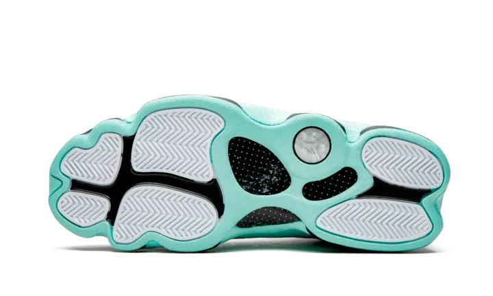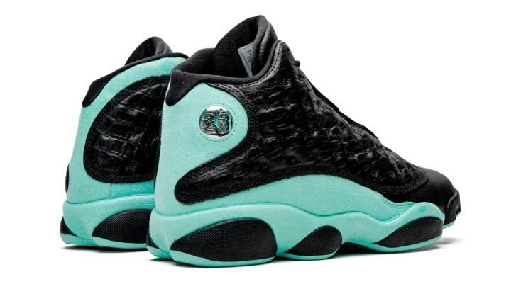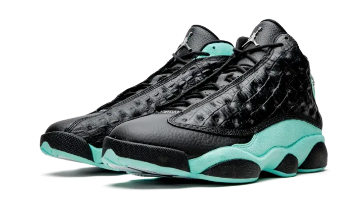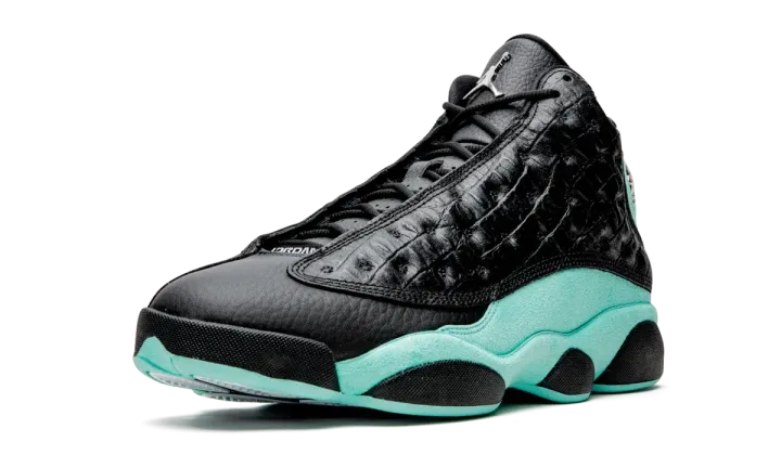 The Air Jordan 13 "Island Green" is a fresh take on the late-90s performance basketball silhouette that now features premium detailing. Coinciding with the release of an "Island Green" Air Jordan 5, the Air Jordan 13 of the same nickname also features a tropical vibe. The unique construction adds a croc skin upper in place of the standard reflective mesh fabric found on standard Jordan 13s. Contrasting the stark black reptilian material are tropical teal overlays on the heel and midsole. Also modified is the Jumpman logo orb at the ankle, which switches from the original holographic jewel to a metal construction in metallic silver. Black rubber pods appear on the outsole mirroring that of a panther's paw, which the original Air Jordan 13 was inspired by. Release date: November 9, 2019.