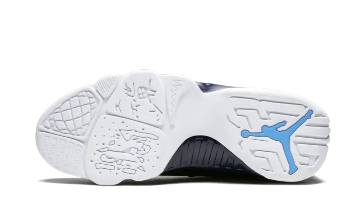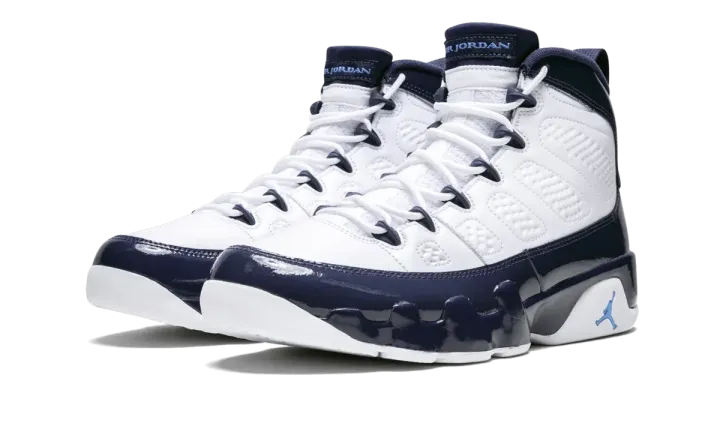 The Air Jordan 9 "UNC" is a 2019 retro of the classic ninth Michael Jordan signature shoe in a color scheme paying tribute to his college career at the University of North Carolina. The white leather, Midnight Navy upper with University Blue accents is actually reminiscent of the classic Air Jordan 9 Low "Pearl Blue" colorway from 2002. The vintage color scheme translates perfectly to the Air Jordan 9 Mid for this new "UNC" colorway, which fittingly released just before the 2019 NBA All-Star Weekend in Charlotte, North Carolina.
